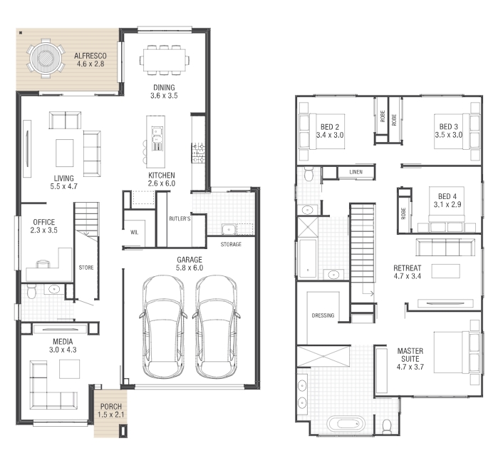 Flexible family living with functionality galore. Packed full of features including a designated e-space, upstairs retreat, downstairs media room, and a butler’s pantry too! An ideal design if you work from home – you can still separate work and play with a home office tucked away. You’re not shy of living spaces too, with the open plan area and media room downstairs, and a private retreat upstairs – there won’t be any fighting over the remote in your new Jordan home.