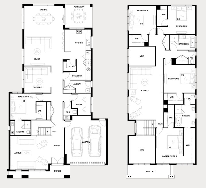 The Elizabeth’s ground floor begins with an open entry leading to a lounge with a fireplace and soaring double-height ceiling. This space flows into a spacious gallery, with access to a guest master suite, a study, and a theatre room, culminating in a large open-plan kitchen with a scullery and dry pantry, seamlessly connected to the family and meals area, with easy access to outdoor living spaces. Upstairs, the luxurious master bedroom sits at the front of the home with balcony access, dual walk-in robes, and an ensuite. It also features two additional bedrooms, each with their own ensuites and walk-in robes, and a generous rumpus area overlooking the lounge below.