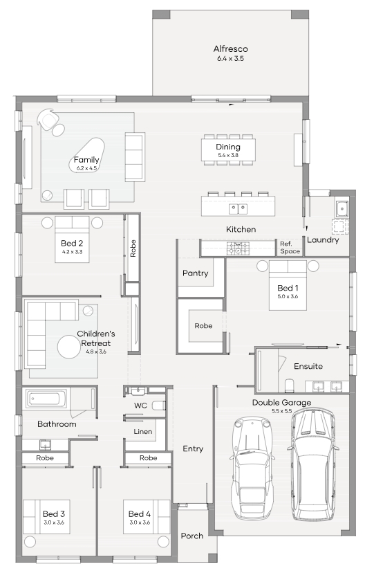 The Hamilton 29 is a sizeable and attractive single storey design. It radiates a sense of luxurious volume yet delivers a casual edge with a strong emphasis on function and style. Boasting three bountiful living zones and four generously sized bedrooms, the Hamilton caps it off with its spacious kitchen, walk-in pantry, linen and spacious Alfresco.