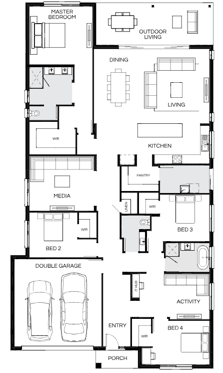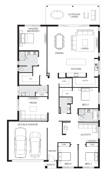 Our ultra-functional Barcelona designs have four bedrooms, multiple living spaces and practical ‘zoned’ kids bedrooms to keep up with the needs of your modern family. Make memories in the open-plan living, dining, kitchen and alfresco areas – your dream entertaining space.