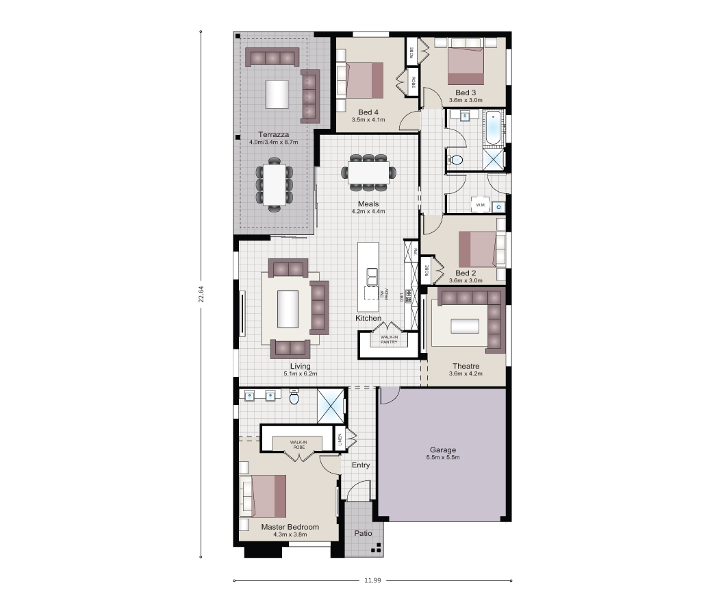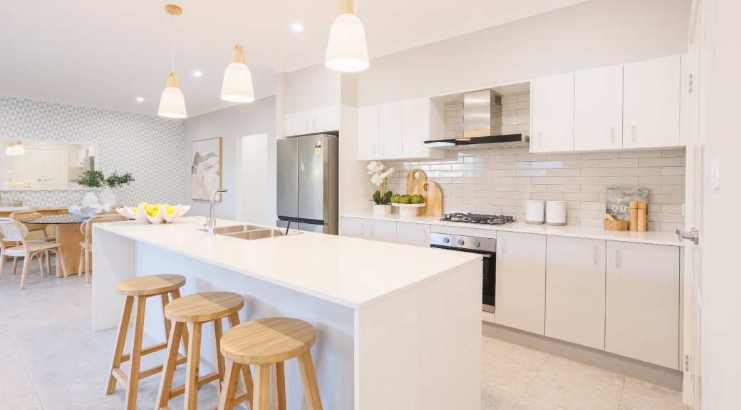Our new Atlanta 26 is a stunning single storey home that has been crafted around the needs of any family. The home boasts three generous bedrooms as well as a grand master to the front of the home and a theatre and/or teenage retreat. The hub of the home, the kitchen, living and dining has been designed so that the space flows seamlessly from one area to the next and out onto the alfresco, making it perfect for those who love to entertain or for families needing space for homework and dinner preparation.