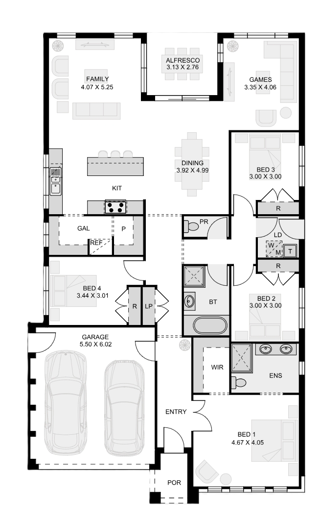 The Liverpool 25 combines modern elegance with everyday comfort in a spacious 4-bedroom, 2-bathroom single-storey design. Tailored for 14m-wide blocks, it features an open-plan living area at the heart of the home, with a designer kitchen, walk-in galley, and dry pantry. The master suite offers a private retreat with an ensuite and walk-in robe, while a dedicated games room and alfresco area make entertaining effortless all year round. This beautiful design is the ultimate blend of sophistication and functionality, making it the perfect dream home for your family.