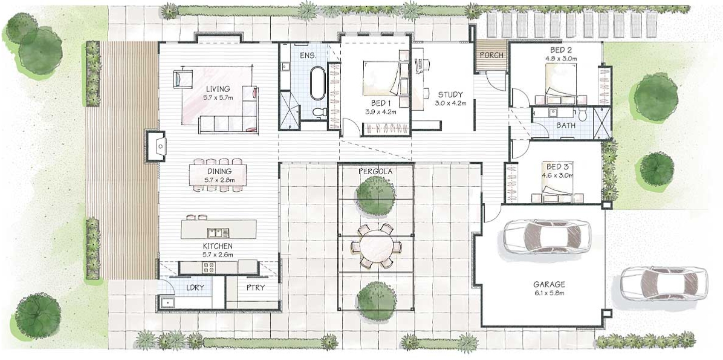 The Mondrian is a stunningly versatile courtyard home. In its side entry form, it's the perfect home for corner allotments, or with a traditional front entry, it will sit easily on a 15m wide block. As it offers views in every direction from its large central courtyard and spacious rear living areas, it is also the perfect home for large properties. As an entertainer it won’t be upstaged. Wide sliding doors provide access to the courtyard and backyard while allowing natural light to spill in.