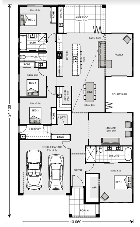 The heart of the home provides an enjoyable open plan living space, featuring a stunning kitchen and butler’s pantry adjoined by the dining and family rooms that extend outdoors to the rear alfresco and a central private courtyard.