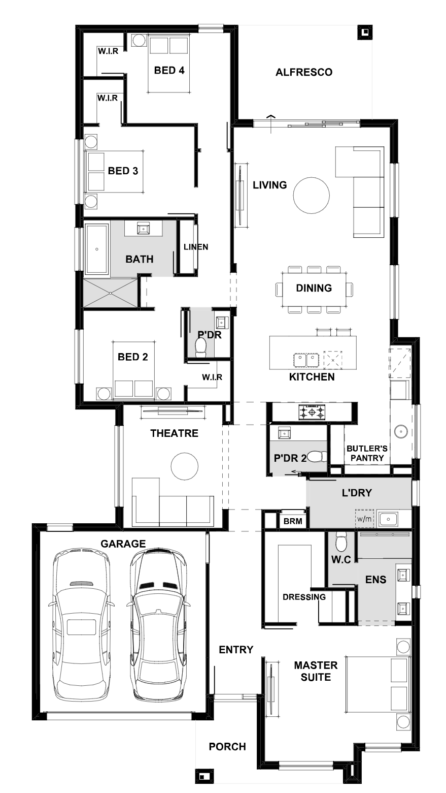 To truly love and call a house a home, there needs to be a layout with features that make you feel welcomed, organised and relaxed…all at the same time - and they are delivered in the Montego. With four bedrooms, double garage and two powder rooms plus a double ensuite, the Montego boasts more as standard. There’s also the integrated, open plan living, alfresco and dining area plus kitchen with Butler’s Pantry, and a separate theatre room