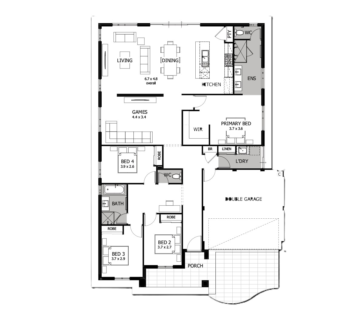 Designed for those who love to entertain, the Wesley is the perfect blend of function and fun! With a rear open planned stacked living, kitchen and dining area, plus a games room, there’s space to entertain all of your friends and family (and more!). A spacious primary bedroom sits at the centre of the home, creating an oasis away from the hustle and bustle. 3 extra bedrooms sit at the front of the home creating a sense of space throughout the home.