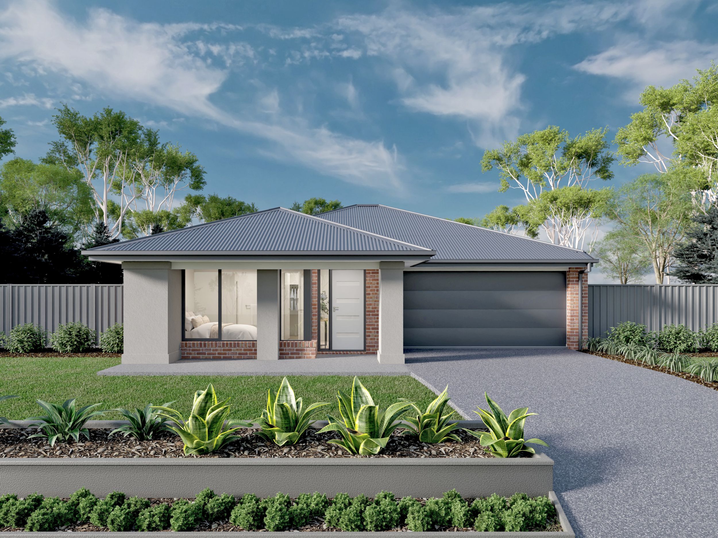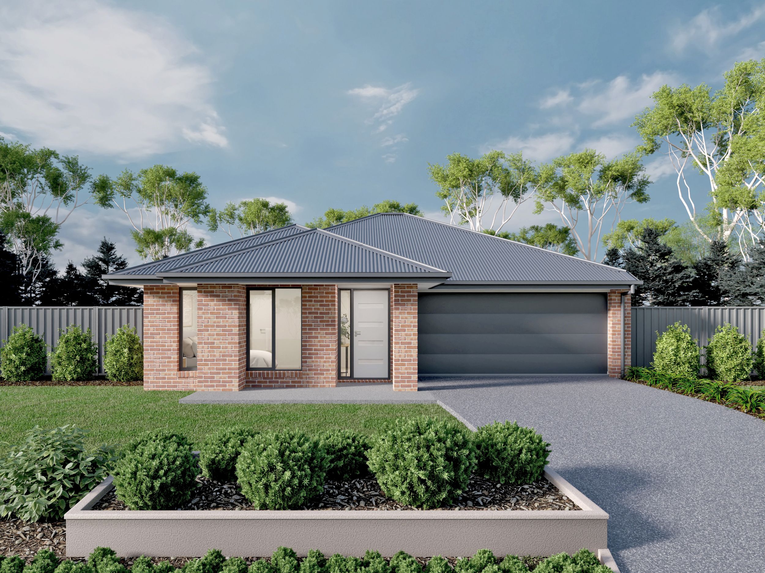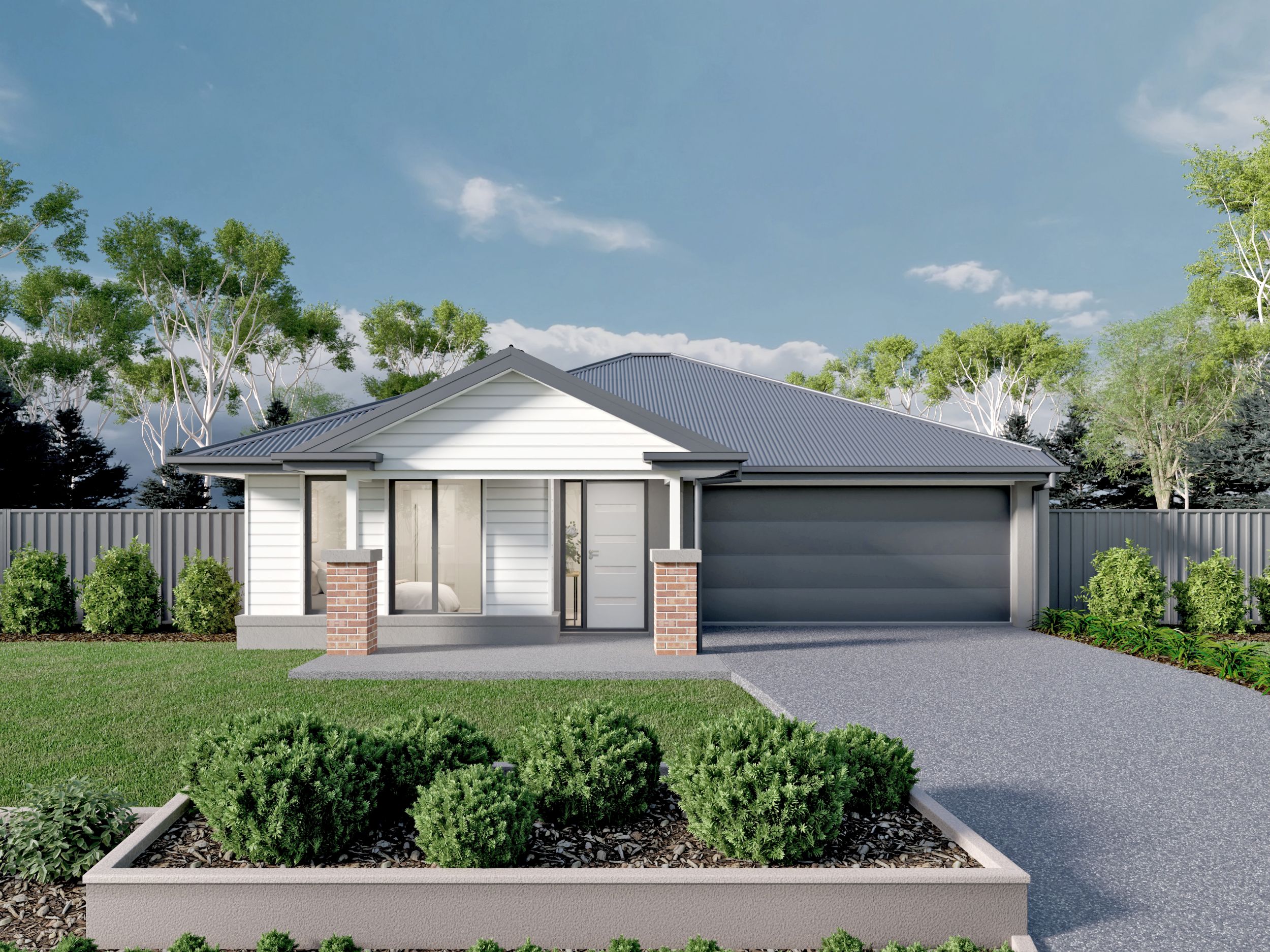 *Price excludes upgrade items above standard specification such as feature render and bricks, front entrance timber decking, front entry door, brick infills above garage, external lighting, fencing, concrete paths and driveway. Facade Image may also contain items not supplied by Metricon, namely landscaping and planter boxes.