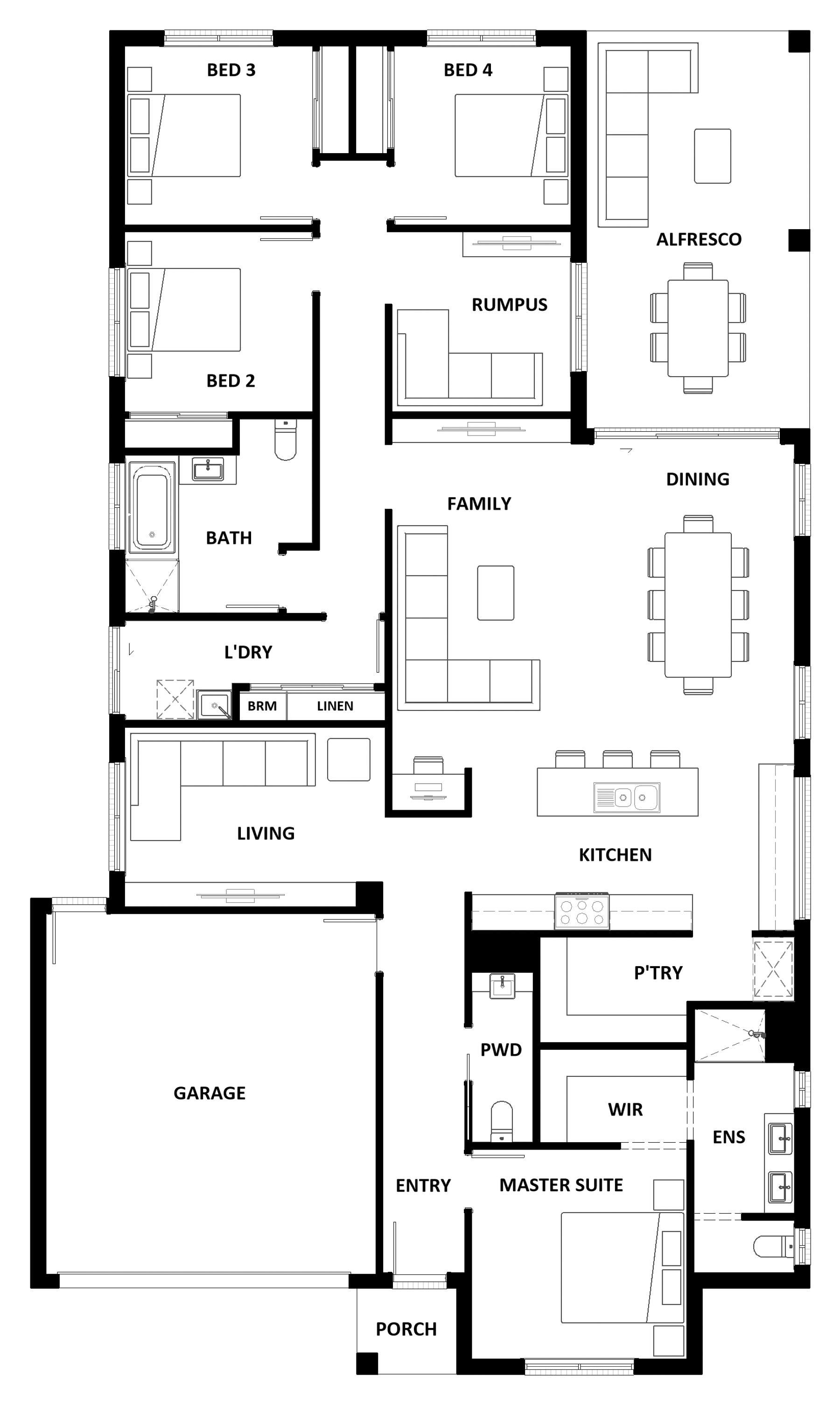With four bedrooms and two bathrooms, the Kirkby 259 is perfect for larger families. With three separate living areas, there is plenty of space for everyone in this home. The kitchen boasts a large walk-in pantry, perfect for those who love to cook. The spacious open-plan living area features a study nook and acts as the heart of the home. The standout feature is the alfresco which connects directly to the kitchen and rumpus, creating the perfect blend of indoor and outdoor living. The master suite is cleverly separated from the other bedrooms and features a walk-in robe and ensuite.