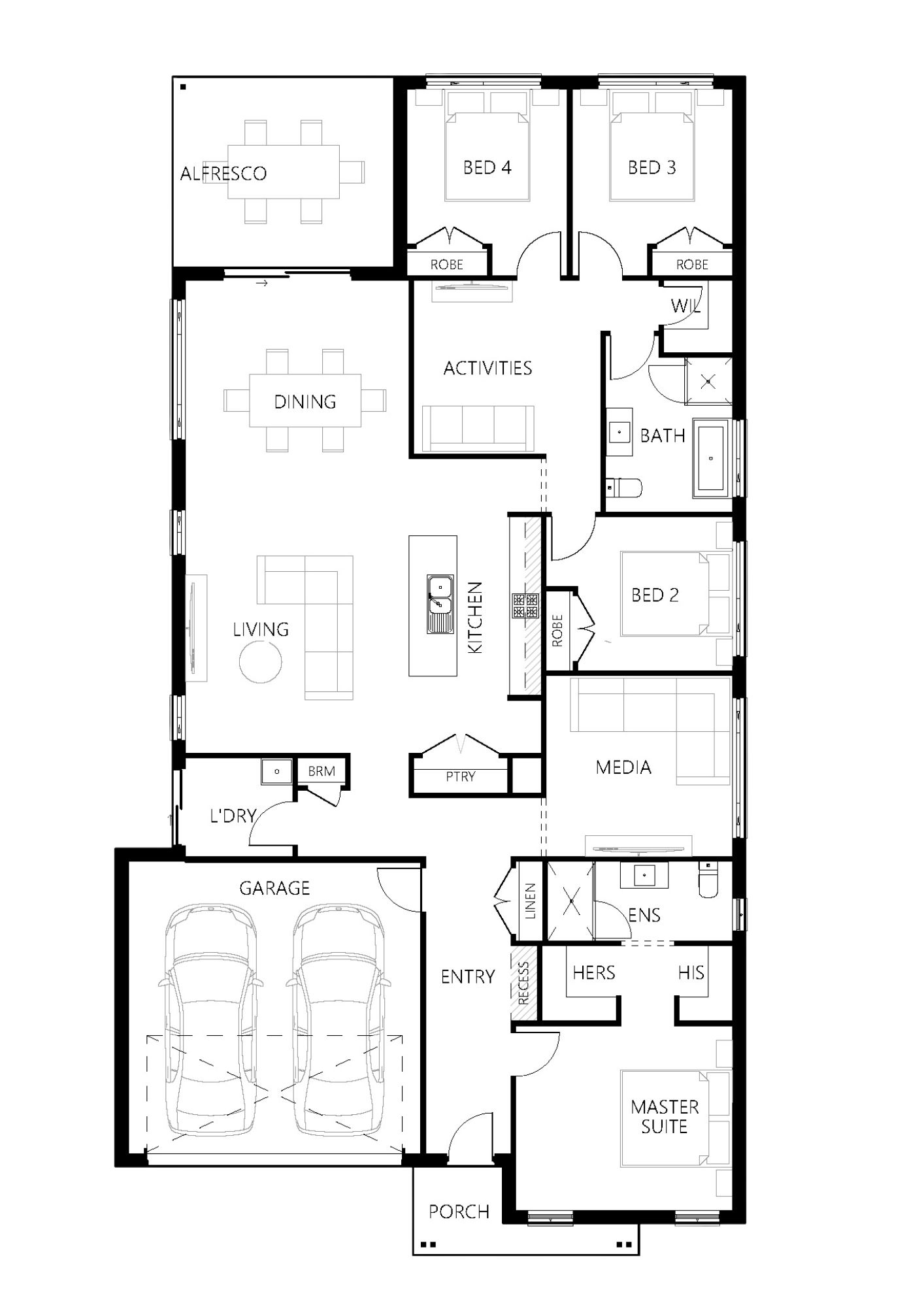 Step into the Chelsea —a home meticulously crafted to optimise space! The master, thoughtfully positioned at the front, features a generous walk-through his and her Wardrobe leading into the ensuite. The media room room is conveniently located off the entry hallway, while the three remaining bedrooms are situated at the rear, complete with a family bathroom and a study nook that can be secluded from the open-plan living and dining. The galley-style kitchen, boasting a walk-in pantry and island bench, gazes over the dining and living area, opening to a spacious alfresco—a perfect haven for comfortable living