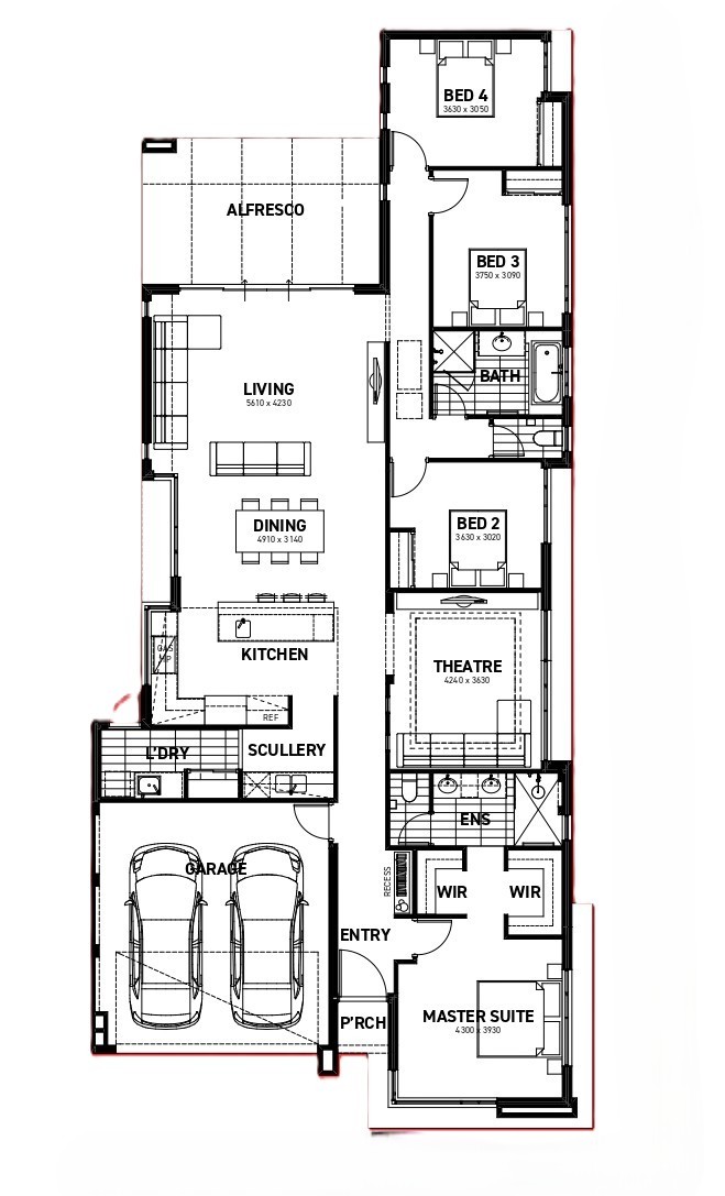The Messina is an outstanding design well suited for the shallower block. The master bedroom includes a generous walk-in robe and an ensuite bathroom with a double vanity and hobless shower. Leading through to the rear of the home are three minor bedrooms with built in robes. The design features even include a scullery and a theatre making this home perfect for entertaining.