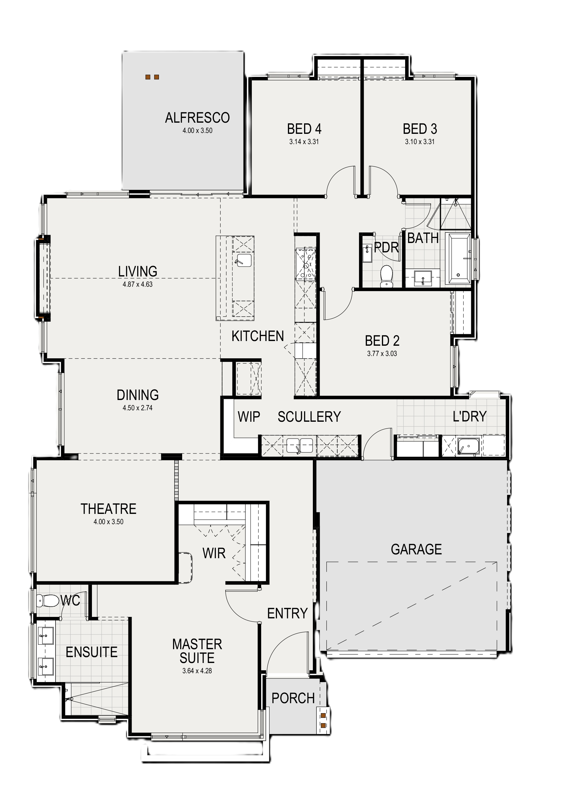 The innovative design of The Dahlia provides a seamless blend of functionality and comfort. Open plan living enhanced by large gable windows and raked ceilings create a cathedral-like feel, elevating the adjacent theatre and alfresco.