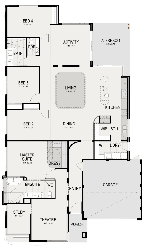 The Willow is a contemporary home that blends practical design with understated luxury. A welcoming entry leads to the private adults’ retreat, featuring a generously sized bedroom, open dressing area, and hotel-style ensuite. A nearby study and theatre create refined spaces for both focus and relaxation.