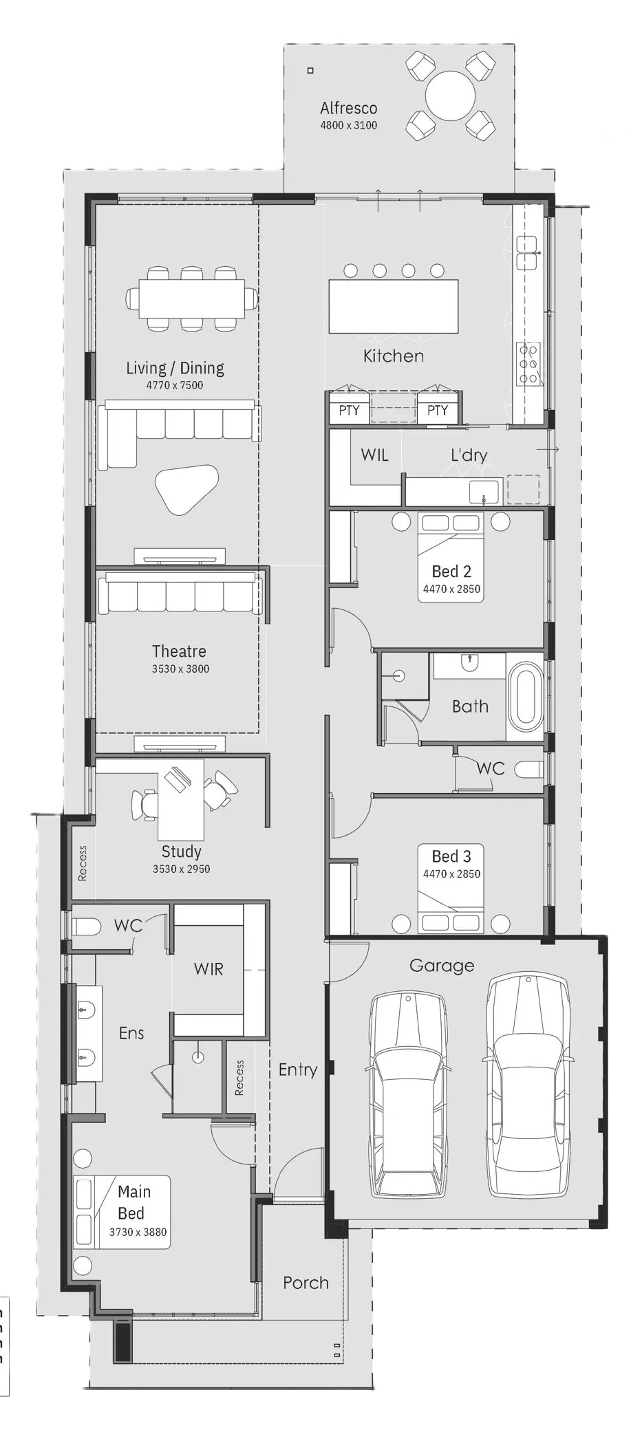 The Lomandra features rear living with seamless indoor-outdoor flow. A dedicated study offers space for homework, while the theatre is perfect for movie nights.