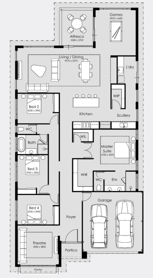 Unwind in the peaceful theatre room, designed for cosy family movie nights, creating a cinematic ambience. The luxurious main suite awaits, offering a private sanctuary with grand double doors and an ensuite adorned with marble-look tiles, a double vanity, and a walk-in robe.
