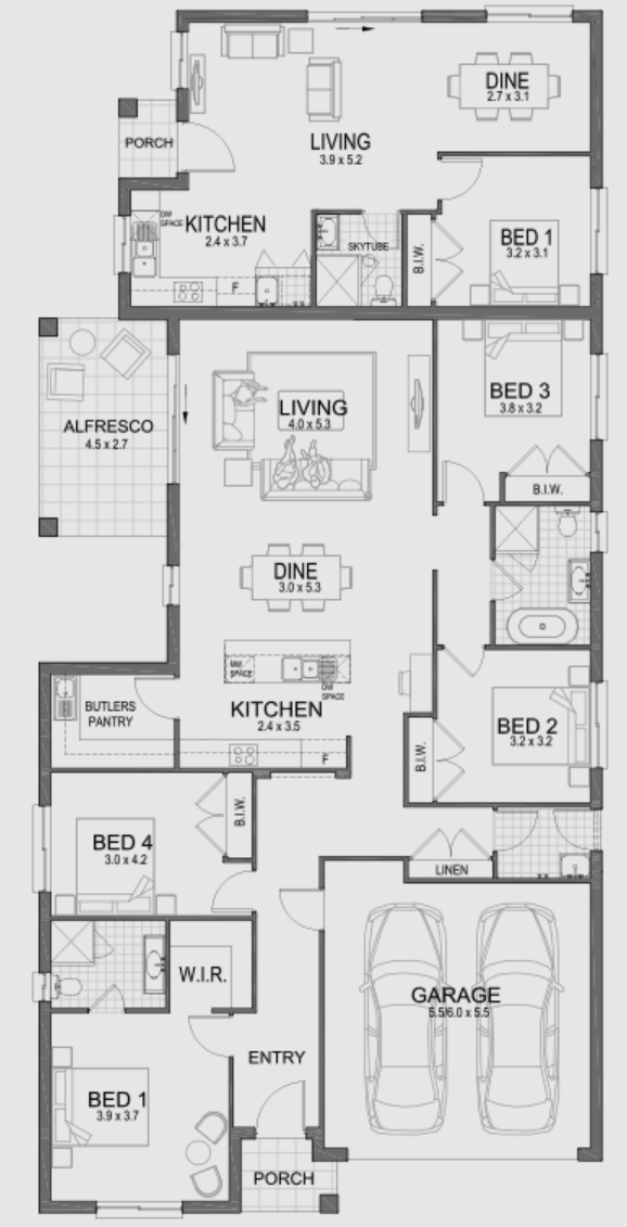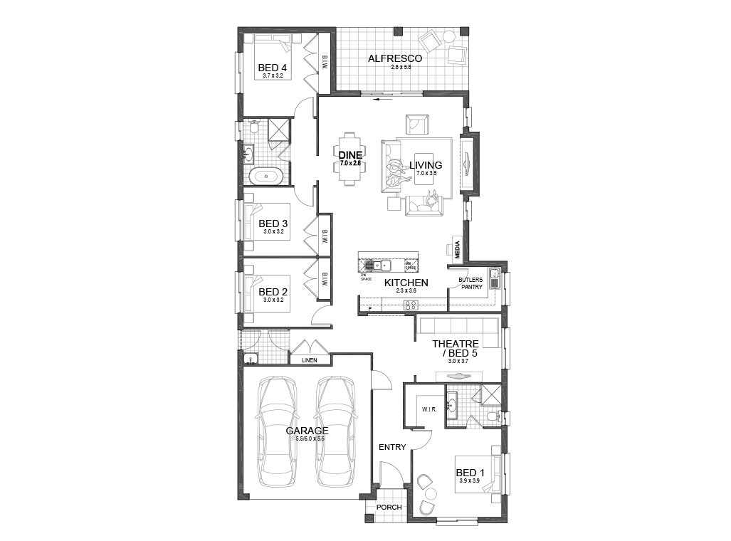 The Ivy 5 is a smart, affordable 4-bedroom, 2-bathroom home designed for modern family living. With the flexibility to add a 5th bedroom or home theatre, this layout grows with your needs. Enjoy open-plan living anchored by a contemporary kitchen with walk-in pantry (or optional butler’s upgrade), plus seamless flow to an alfresco courtyard — perfect for relaxed entertaining in style.