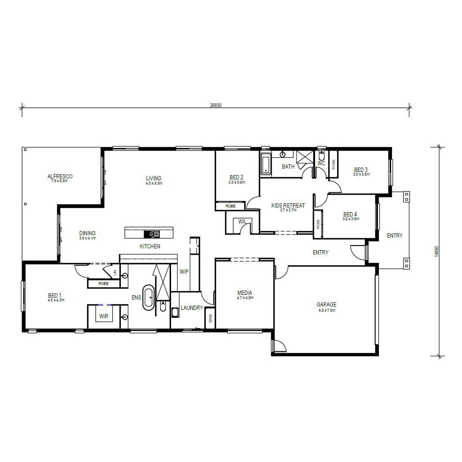 The impressive Louise has been designed to create space for all family members. The design is practical and spacious, with the house segmented into living and bedroom quarters. Offering a media room, open-plan living, kid’s retreat and generous bedrooms, you’ll be sure to find a peaceful spot to unwind. The gourmet kitchen offers a butler’s pantry and expansive bench and cupboard space. The double garage provides access to the yard and the large alfresco area will become an extension to the open-plan living.