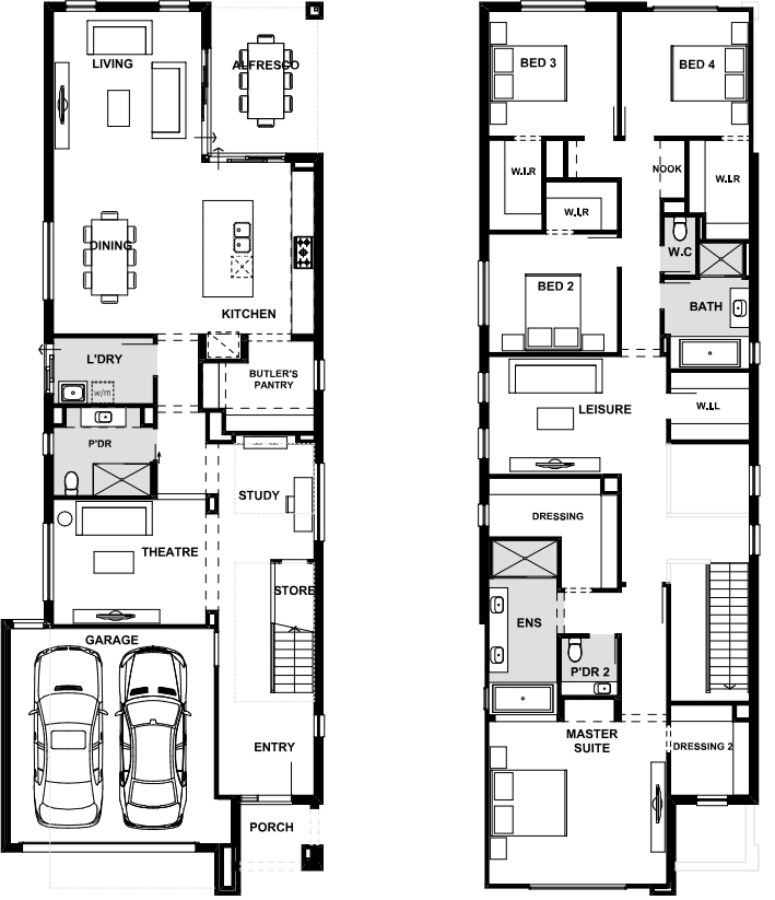 Don’t be deceived by the 10m wide frontage, this design packs a punch and has not compromised on features. All rooms are cleverly integrated and seamlessly connect to the open plan living hub with a chef’s kitchen and grand butler’s pantry.