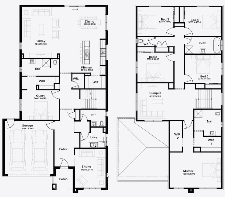 Designed for 14m+ blocks, the Gresswell 41 includes 6 bedrooms, 3 bathrooms, and a 2-car garage over two floors. The ground floor boasts two living areas ideal for entertaining, an open-plan design, and a kitchen with ample storage and walk-in pantry. Upstairs, the luxurious master bedroom features dual walk-in robes and an ensuite. Four additional bedrooms with built-in cupboards surround a family bathroom, while the rumpus room can serve as a home theatre - the perfect floor plan for families of all stages.