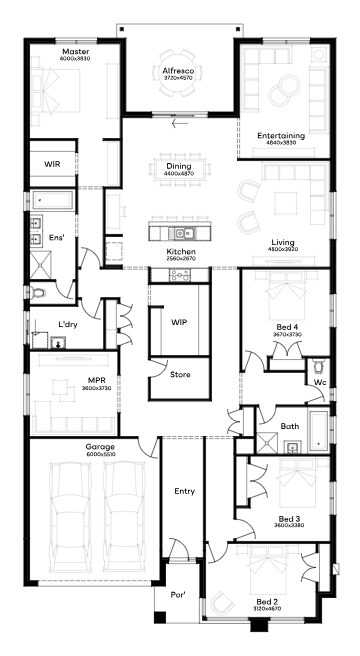 Designed for 16m+ blocks, the Willandra 34 features 4 bedrooms, 2 bathrooms, and a 2-car garage. The entry of this single-storey home invites you to peel off to the children’s wing on one side or the second lounge and master suite on the other before leading to the open plan heart of the home at the rear. Here, an entertainer’s kitchen overlooks the dining, courtyard-style alfresco, and multiple living areas. The modern master bedroom, tucked away with garden access, offers privacy, while the secondary bedrooms, study, and media room towards the front provide individual spaces for work, play, and connection.