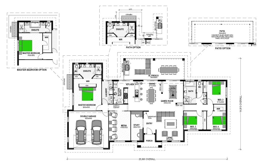 At around 26 meters wide, the Kentucky 304 is right at home on acreage land. In its ideal orientation (north up) the Alfresco and living areas are bathed in warm morning light, creating a most comfortable home.