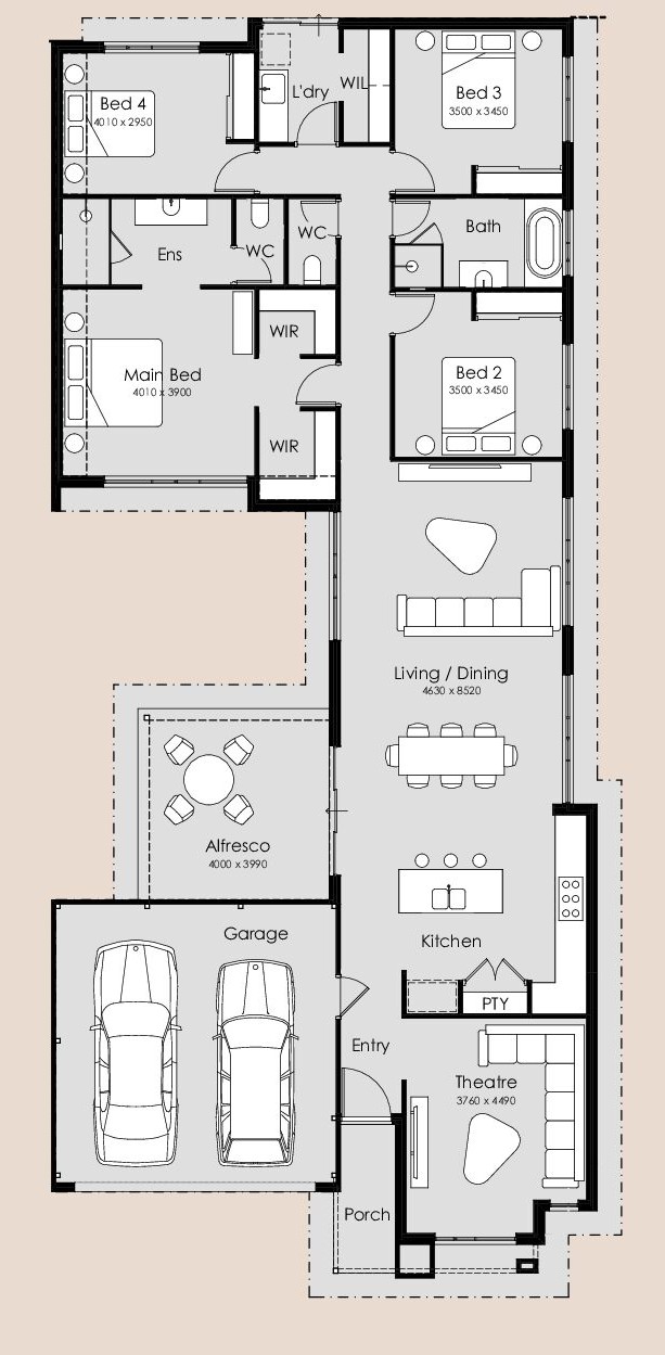 Overlooking the vast living area is a designer kitchen that ticks all the boxes, presenting a large island bench, ample bench space, a large pantry, plenty of storage, and convenient shoppers entry direct to the kitchen. Whilst the chef creates delicacies, family and friends can soak up the Australian weather on the alfresco and, later, adjourn to the elegant private theatre located at the front of the home.