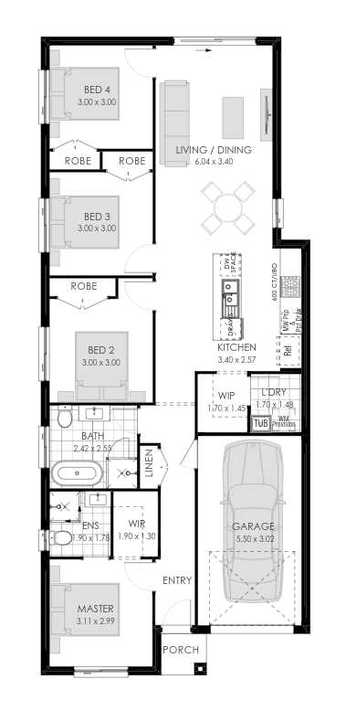 This smart and efficient family home design features four well-sized bedrooms, including a private master suite at the front with walk-in robe and ensuite. The central hallway leads to an open-plan kitchen, living and dining area that opens to the backyard. A single garage, walk-in pantry, separate laundry, and well-placed storage make this layout highly practical for modern living.