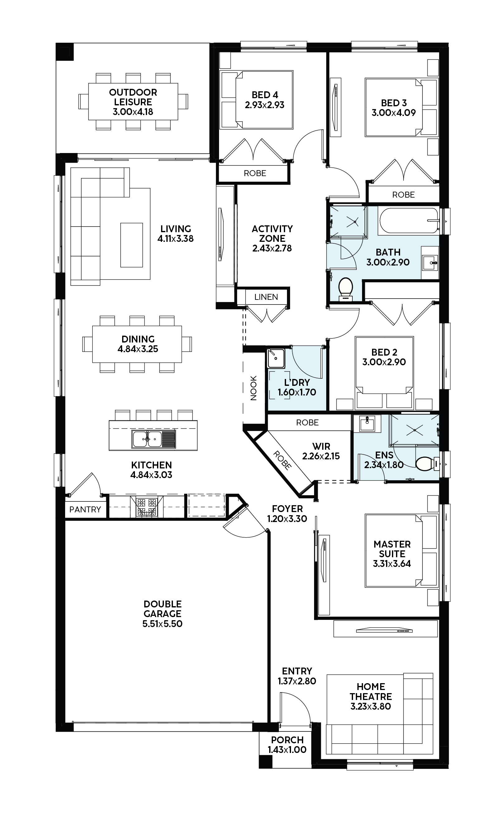 At the heart of the Havana is a dedicated home theatre at the front of the home, making family movie nights or entertaining a breeze. The expansive designer kitchen seamlessly connects to the dining, living, and outdoor leisure area, creating a hub for gatherings and daily life.