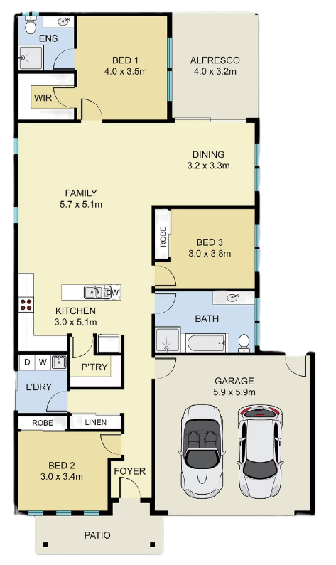 The Happy 194m2 house design is a charming and spacious home that offers comfortable living with three bedrooms, two bathrooms, and a two-car garage.