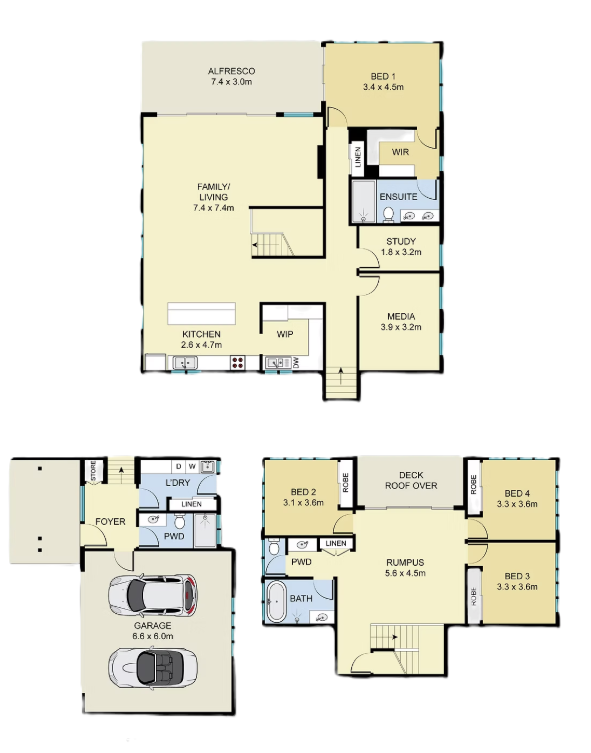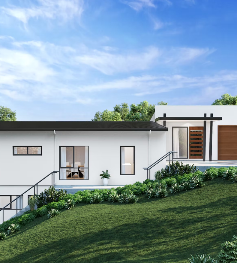 The Woombye is a stunning ultra-modern split-level house with a striking render facade, designed to be perfectly suited for a sloping block of land. This home takes advantage of every inch of the block, with a clever layout that maximizes space and functionality.
