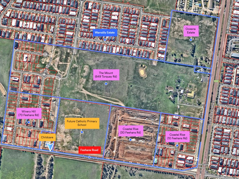 The suburb boundary is located along the rail corridor to the North, with Ghazeepore Road, Pettavel Road and Mt Duneed Road making up the western boundary. Blackgate Road provides for the southern boundary, with property boundaries and Surf Coast Highway providing the eastern boundary.