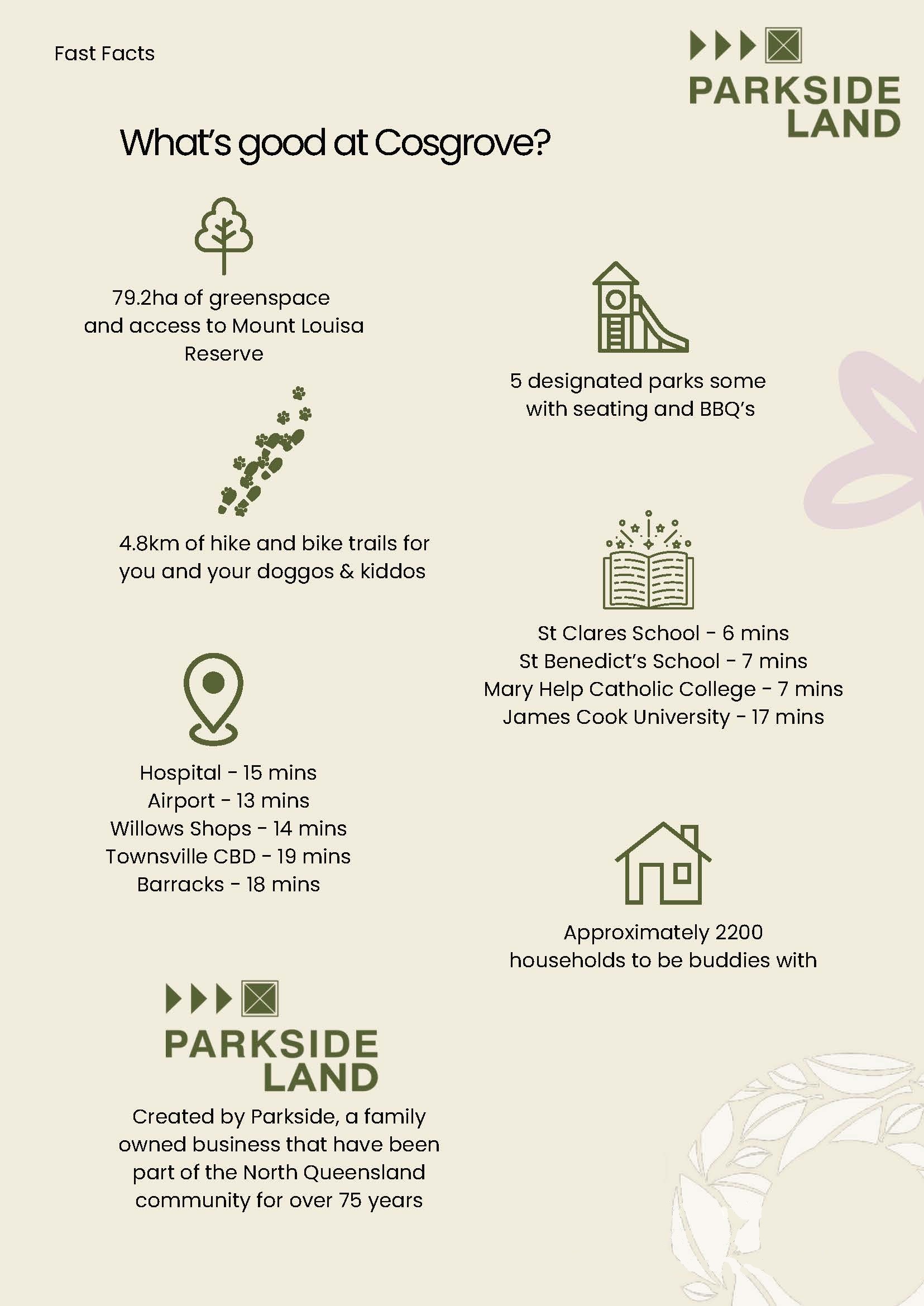 Perfectly placed, Cosgrove puts you where you want to be. Just 20 minutes from the heart of Townsville’s CBD, The Strand’s ocean views, and the roar of Cowboys Stadium on game night. Head the other way and it’s less than 15 minutes to Lavarack Barracks, the University Hospital, and James Cook University.