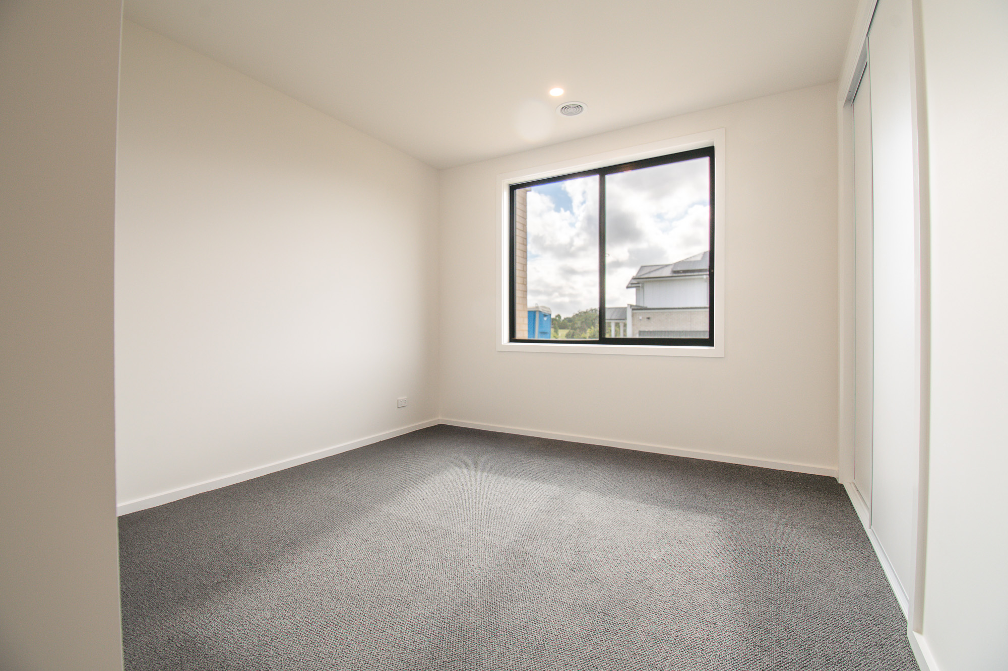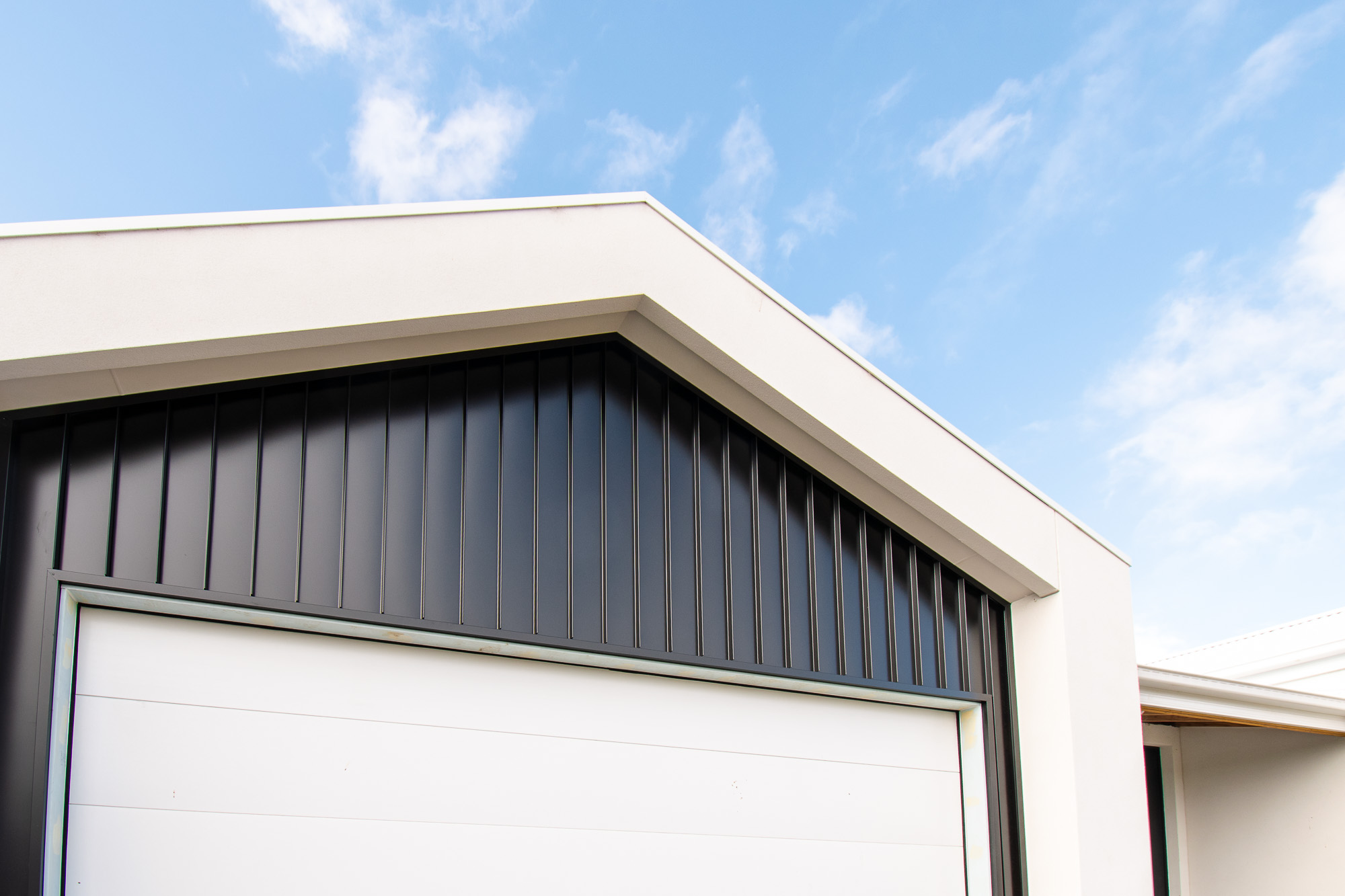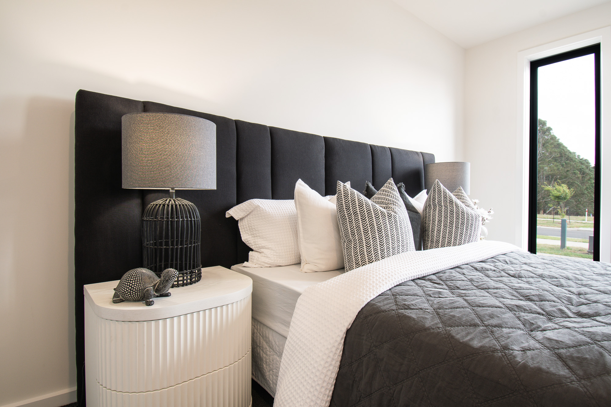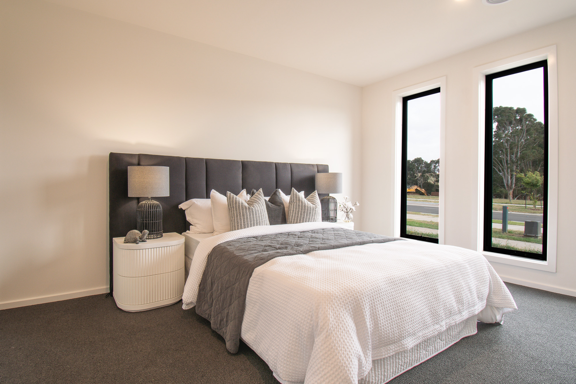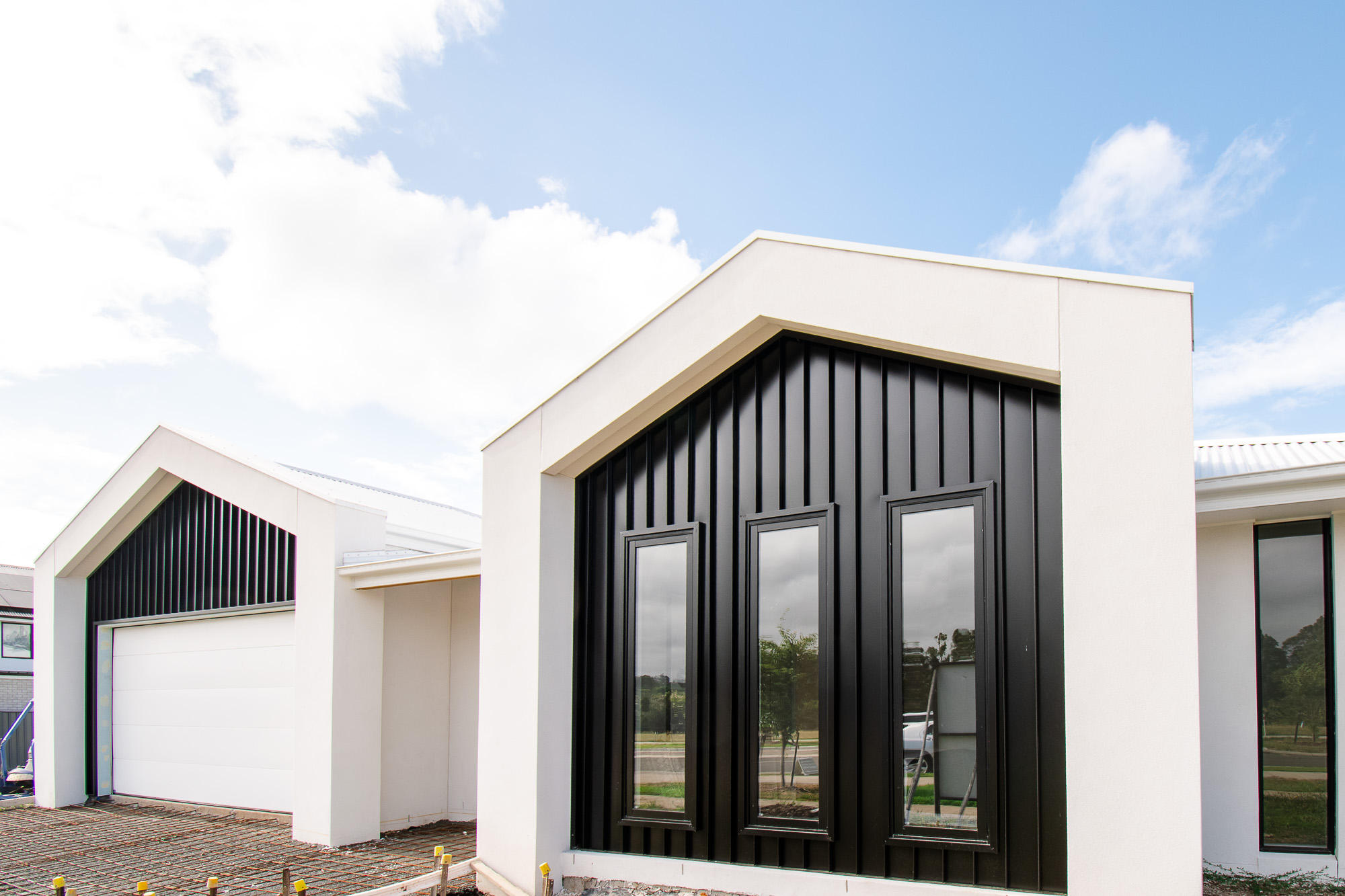 The striking faƧade features rendered brickwork, upgraded Austral bricks in Prayline, Colorbond cladding in Nightsky and powder-coated black windows, complemented by an exposed aggregate driveway and portico entrance. A landscaped front yard introduces the home, while the expansive rear yard offers room for a lap pool or shed, framed by Colorbond fencing with rear access gates.