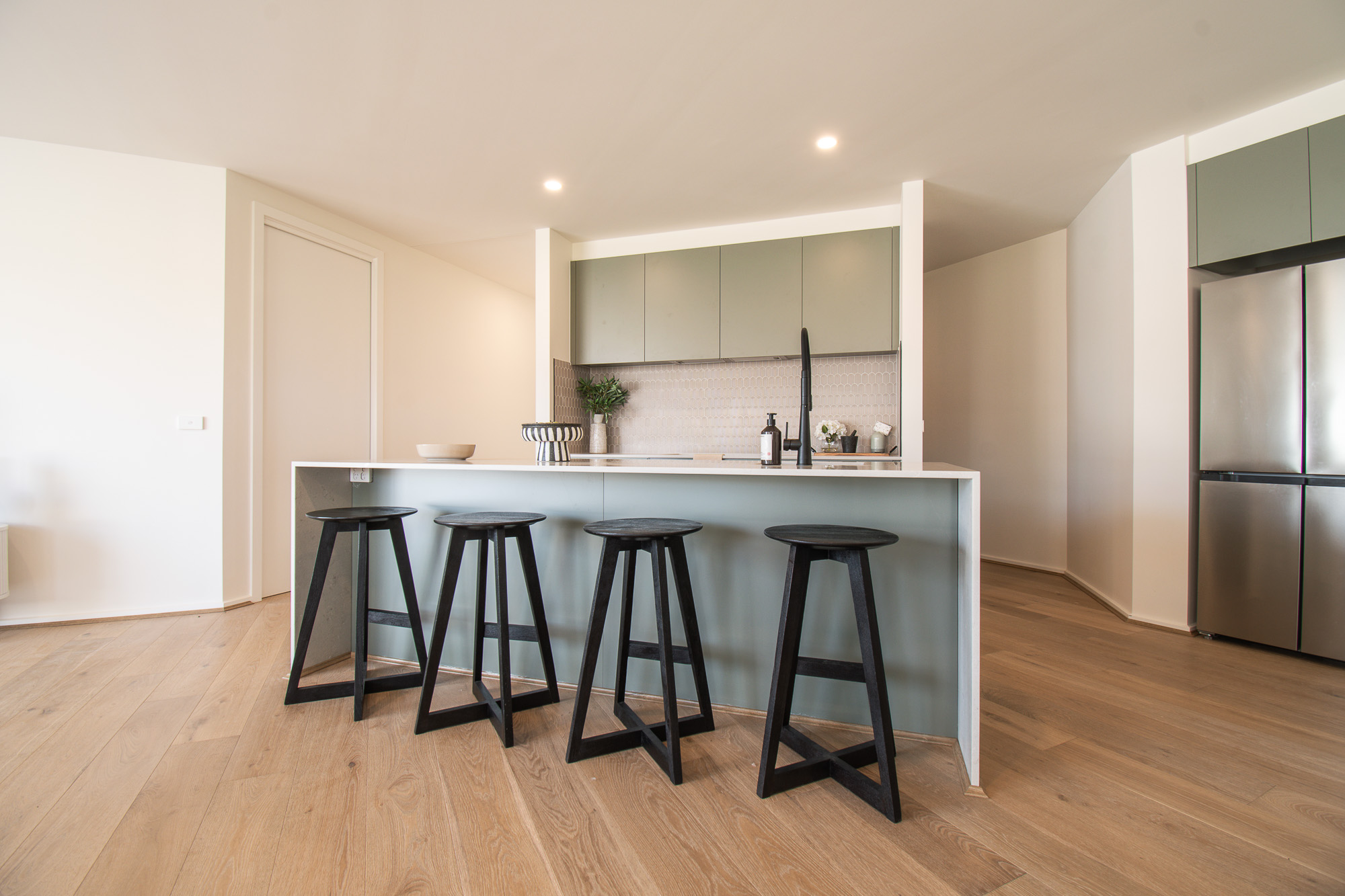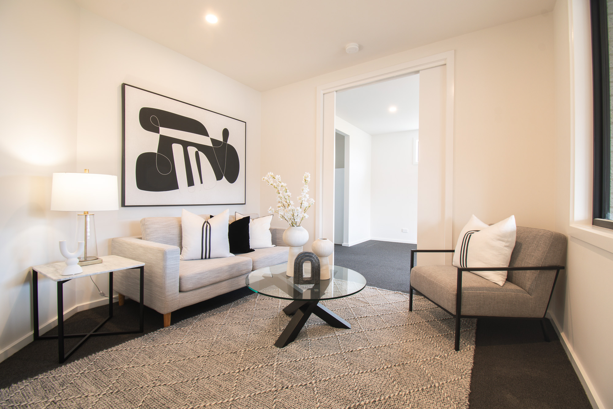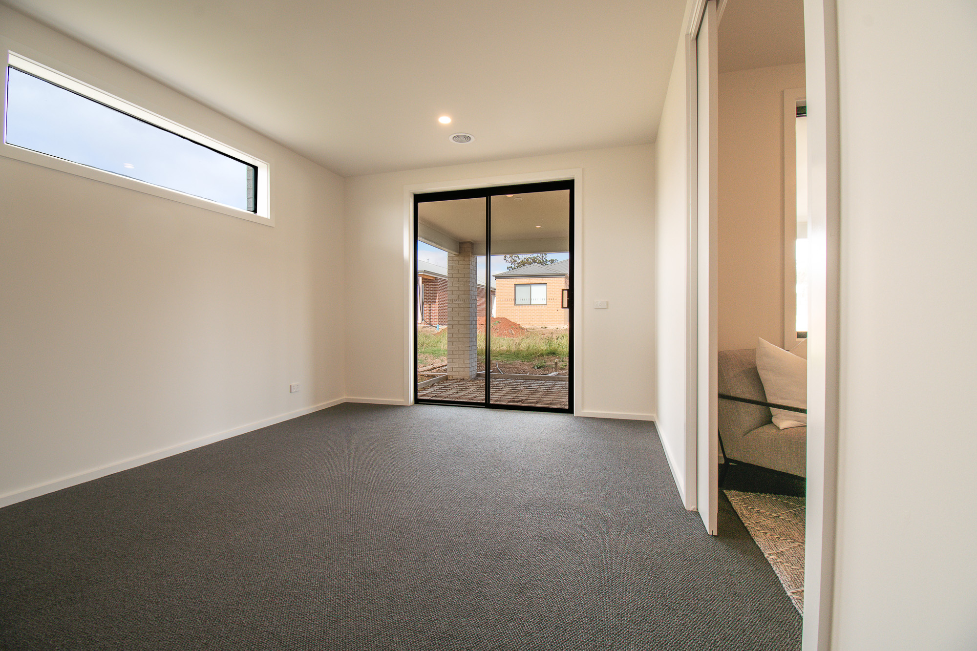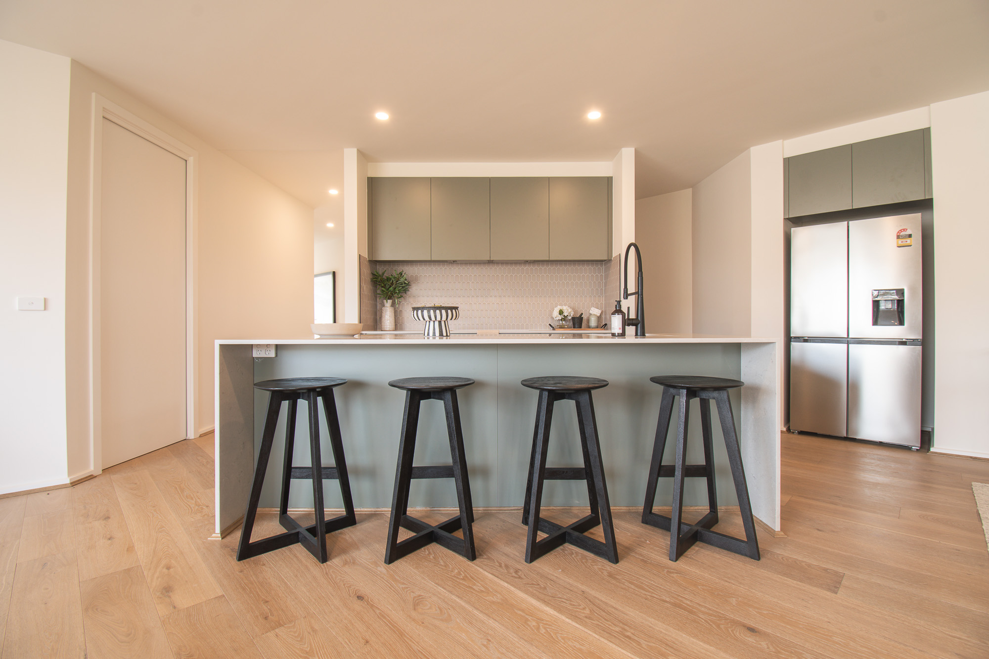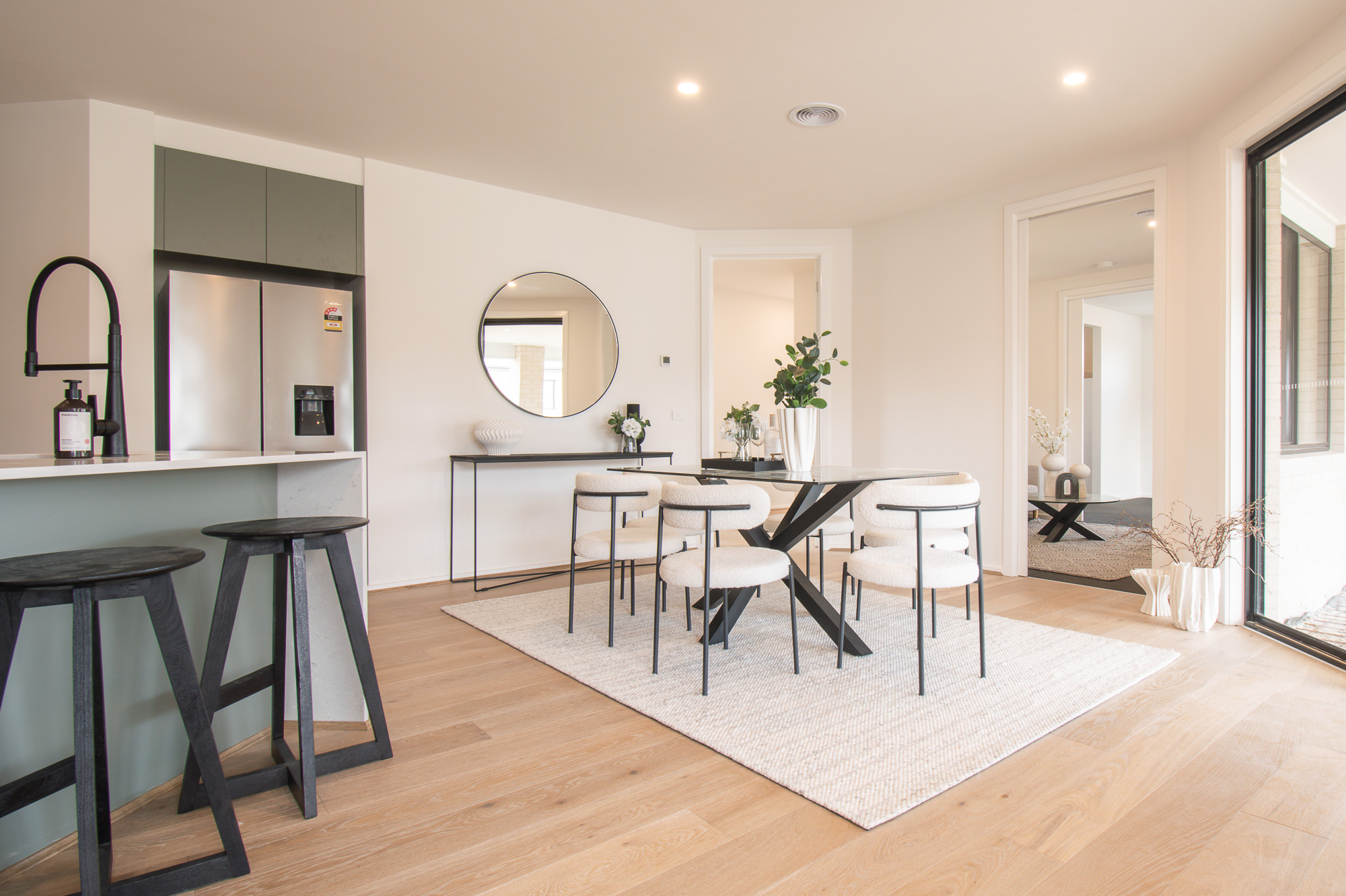 Additional highlights include widened 870mm doorways, black tapware and door hardware throughout, extensive internal storage, flyscreens to all openable windows, multiple sliding doors with hidden handles opening to the backyard, and modern connectivity with NBN fibre optic infrastructure.