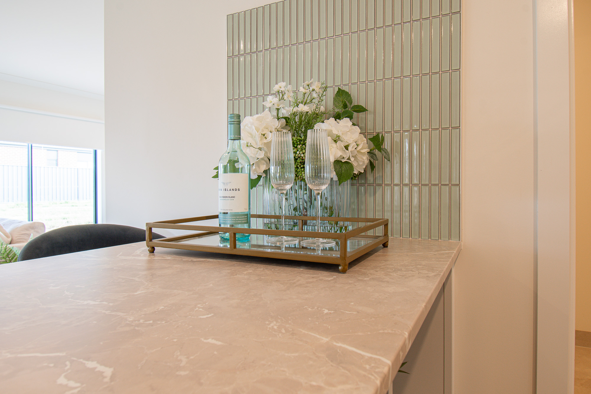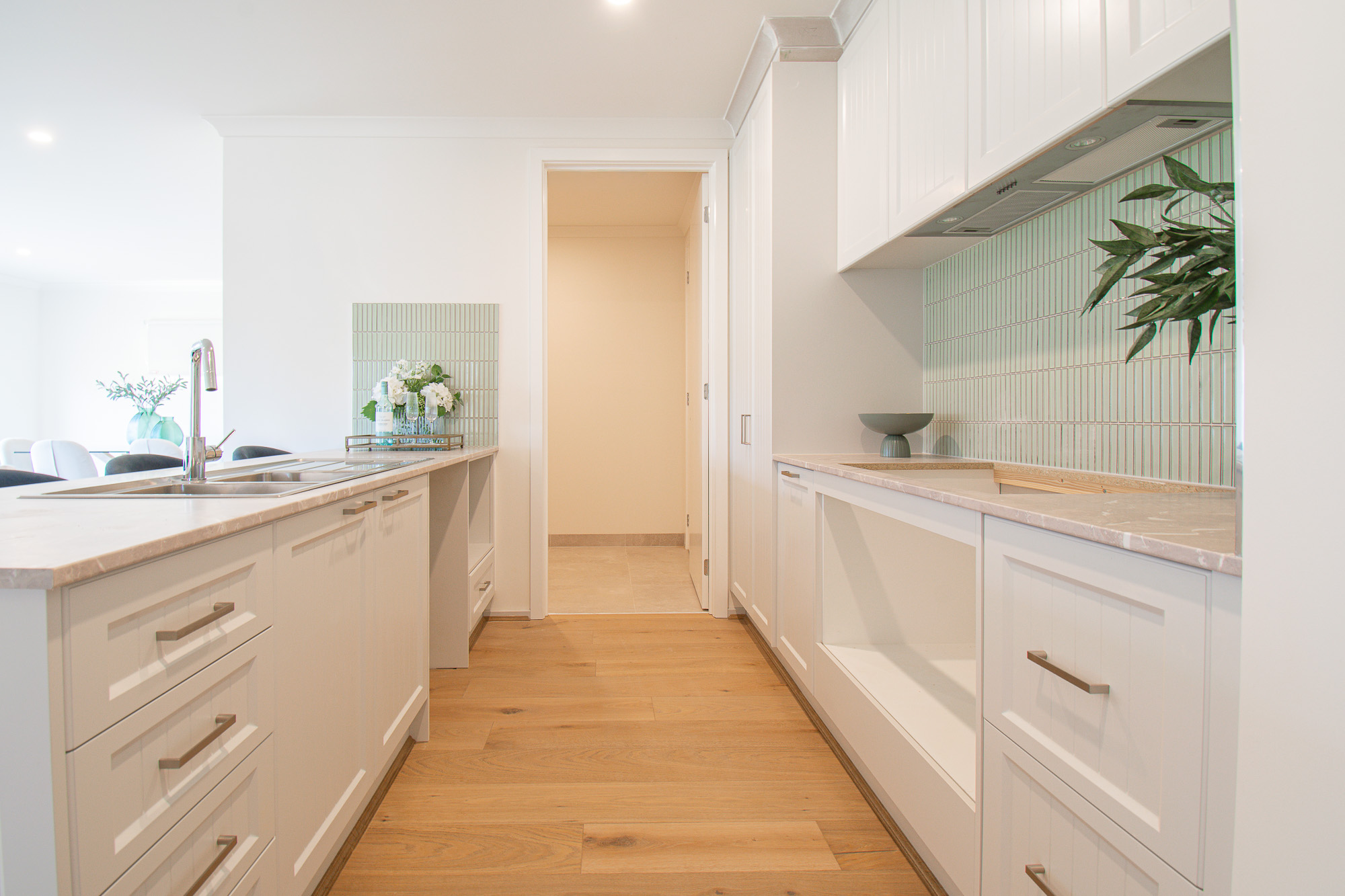 At the heart of the home is the kitchen, featuring Polytech Provincial Limestone Smooth 21mm Laminate benchtops, overhead cabinetry, soft-close drawers, KitKat feature splashback tiles and quality Di Lusso appliances, including a 900mm gas cooktop, electric oven, integrated rangehood and stainless steel dishwasher. A dual sink, microwave and fridge provision complete the space.