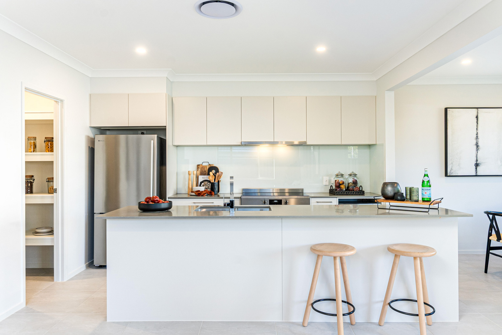 • Kitchen with stone bench tops and stainless steel appliances, soft close draws and glass splashback