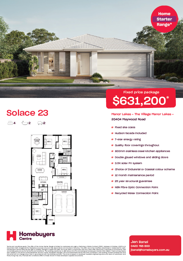 Price based on home type, floor plan shown, builder’s preferred siting and expected land title date. Floor plan depicts a facade shown in CGI and included in price. Image used is an artist impression for illustrative purposes only and may show decorative items not included in the price shown including path, fencing, landscaping, coach lights and furnishings. “Fixed” pricing means that, subject to the terms of this disclaimer and any owner requested changes, the price advertised will be the price contained in the building contract entered into and this price will not change other than in accordance with the building contract. The price is based on developer supplied engineering plans, plans of subdivision and expected land title date. Final pricing may vary if actual site conditions differ to those shown in the developer supplied documents, or if land titling is delayed. Block and building dimensions may vary from the illustration and the details shown. For more information on the pricing and specification of this home please contact a New Homes Consultant. ABN Group Victoria has permission of the owner of the land to advertise the land as part of the price specified. The price does not include transfer duty, settlement costs, community infrastructure levies imposed, or any other fees or disbursements associated with the settlement of the land.