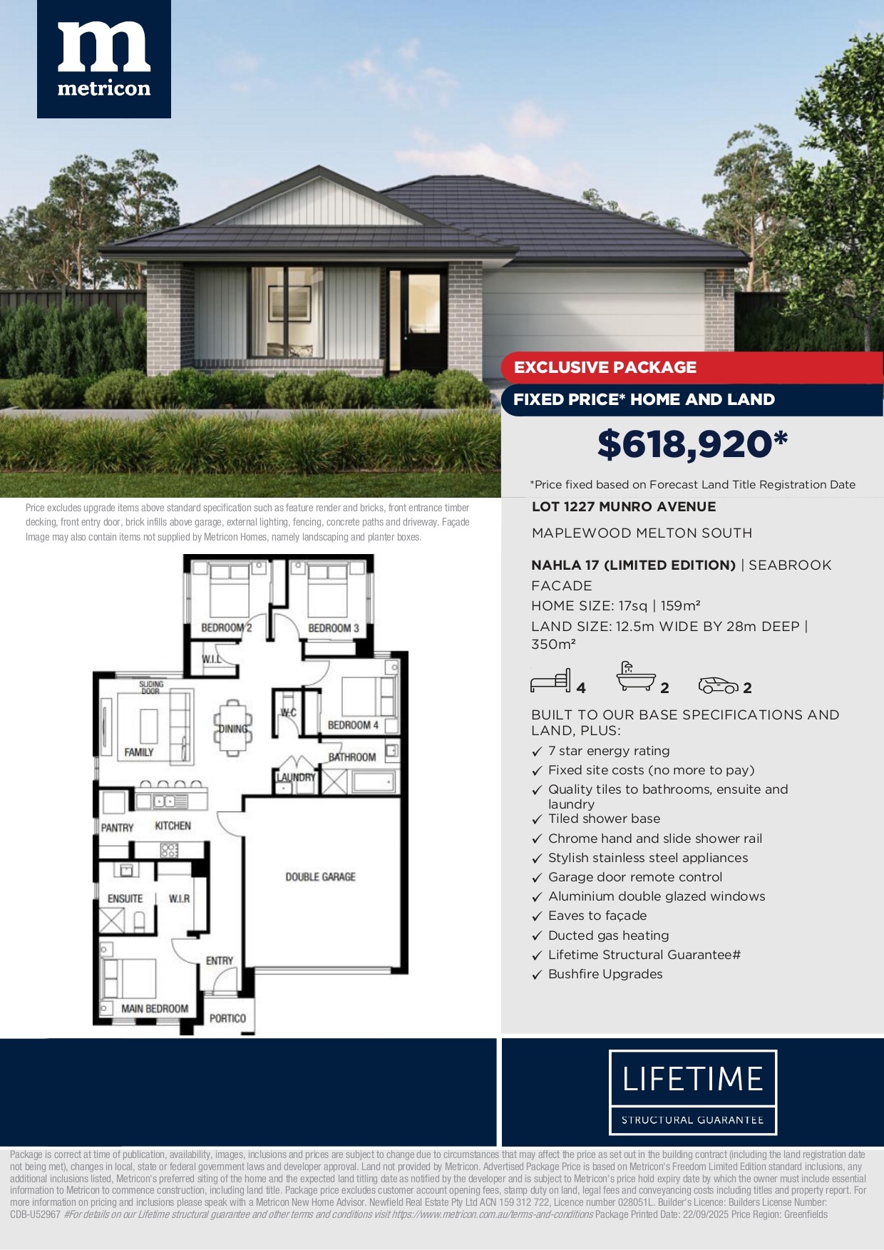 *Price excludes upgrade items above standard specification such as feature render and bricks, front entrance timber decking, front entry door, brick infills above garage, external lighting, fencing, concrete paths and driveway. FaƧade Image may also contain items not supplied by Metricon Homes, namely landscaping and planter boxes.