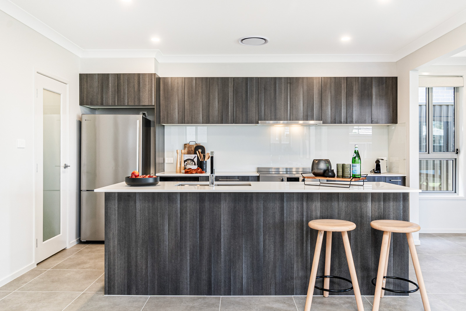 • Kitchen with stone bench tops and stainless steel appliances, soft-close drawers and glass splashback
