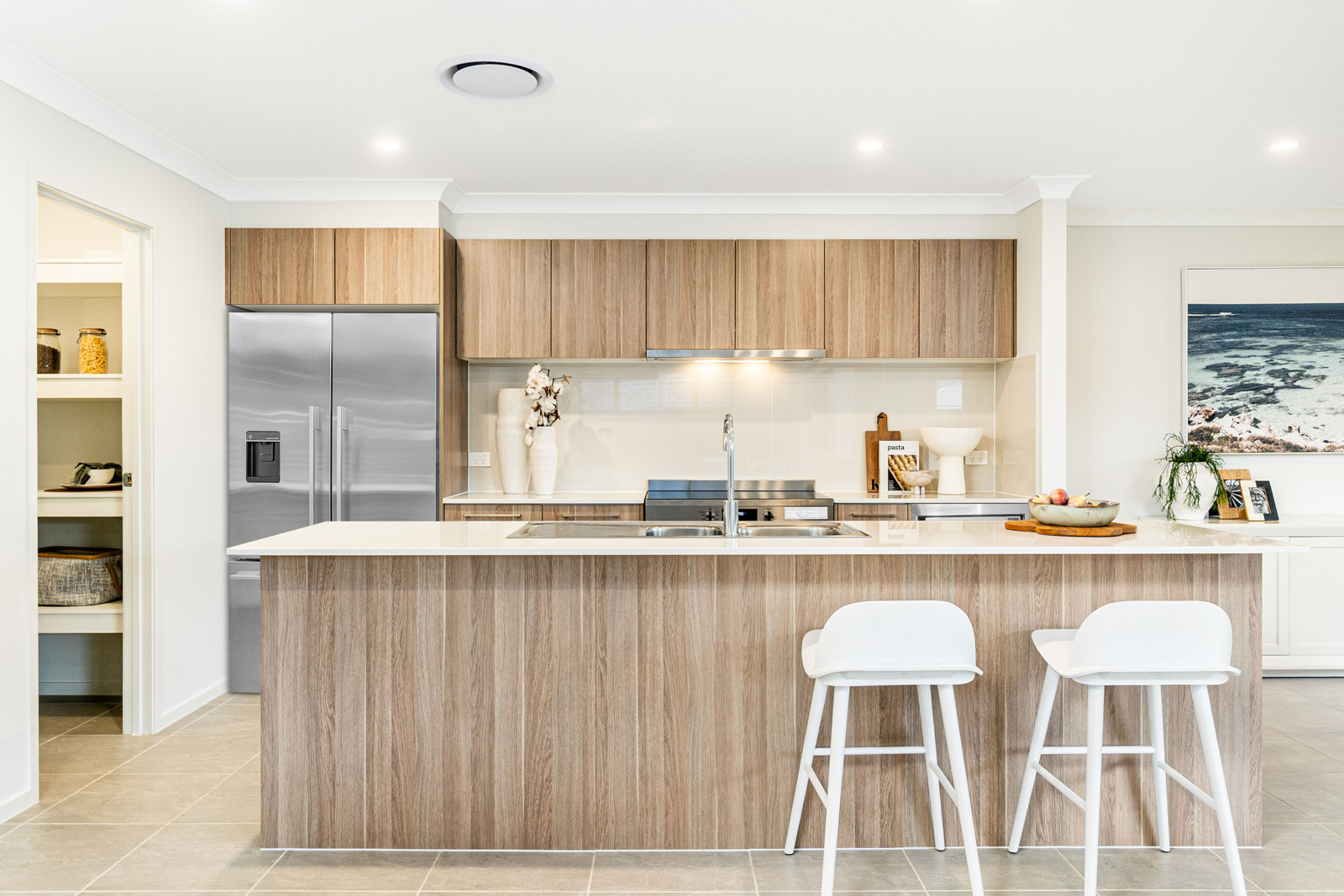 • Kitchen with stone bench tops and stainless-steel appliances