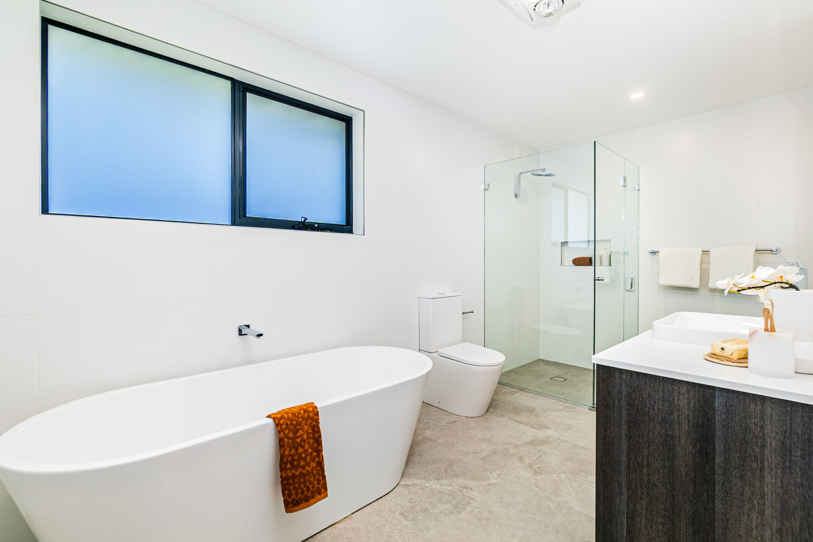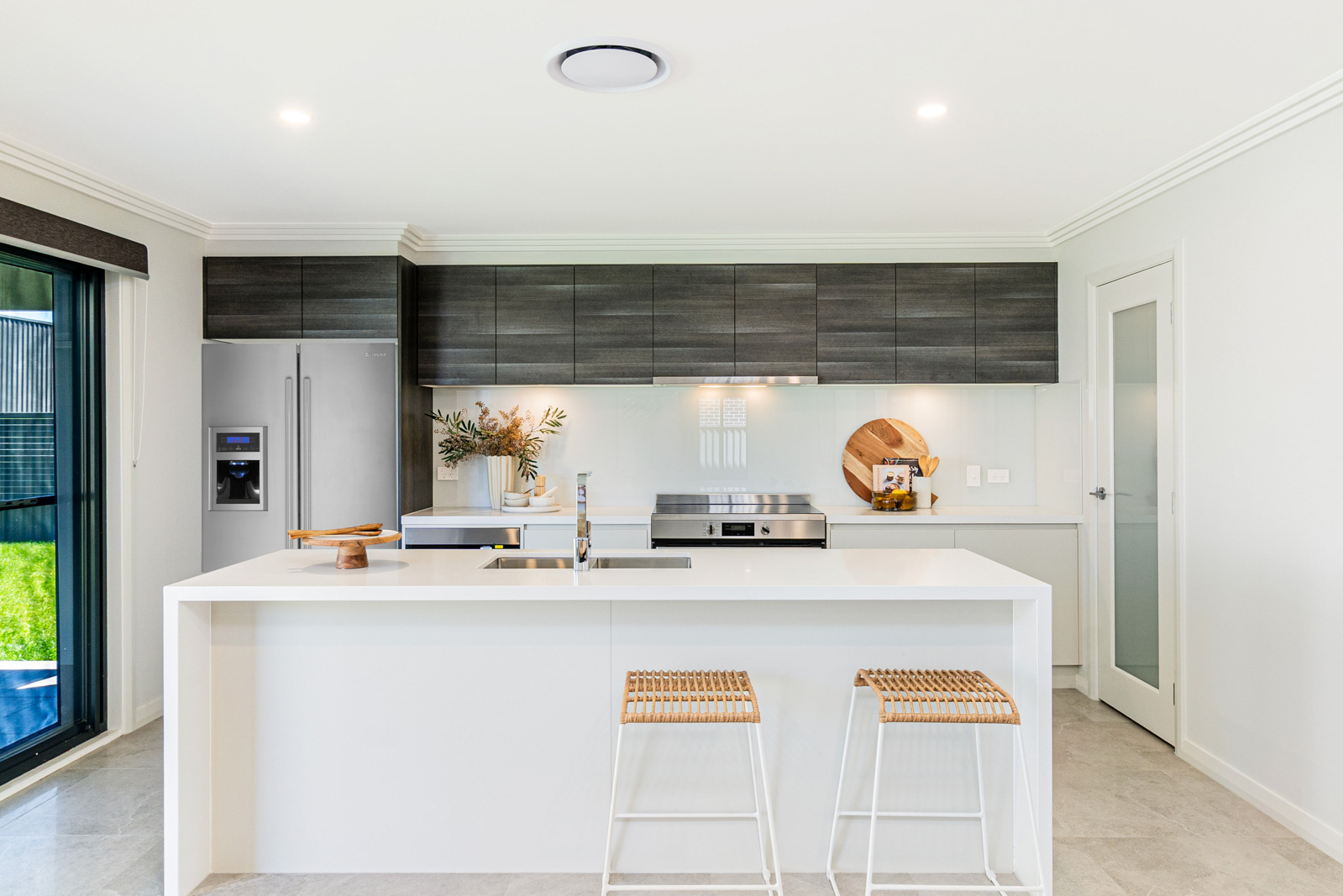 • Kitchen with 40mm stone bench tops with waterfall ends and stainless steel appliances, microwave included, soft-close drawers and glass splashback