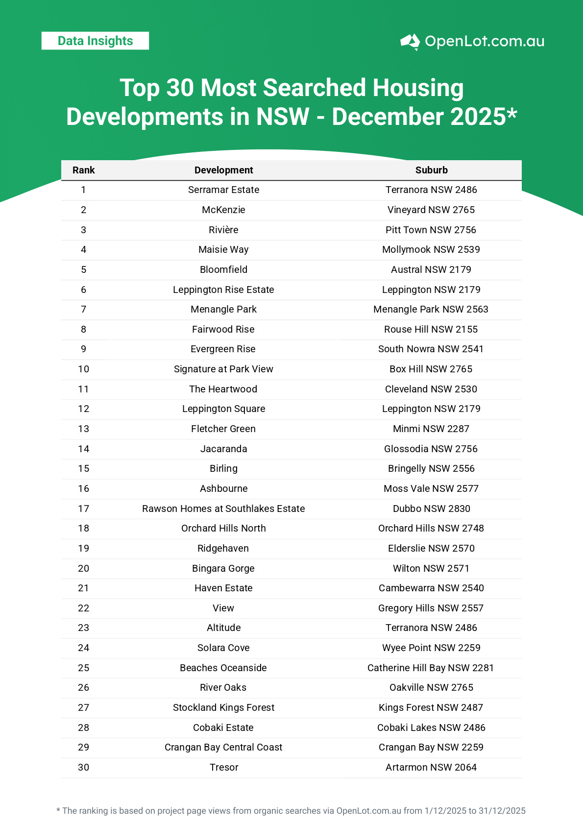 Northern NSW and Western Sydney once again dominated searches, with premium lifestyle estates and major growth corridors maintaining strong buyer interest. Coastal destinations and established family suburbs also featured prominently.