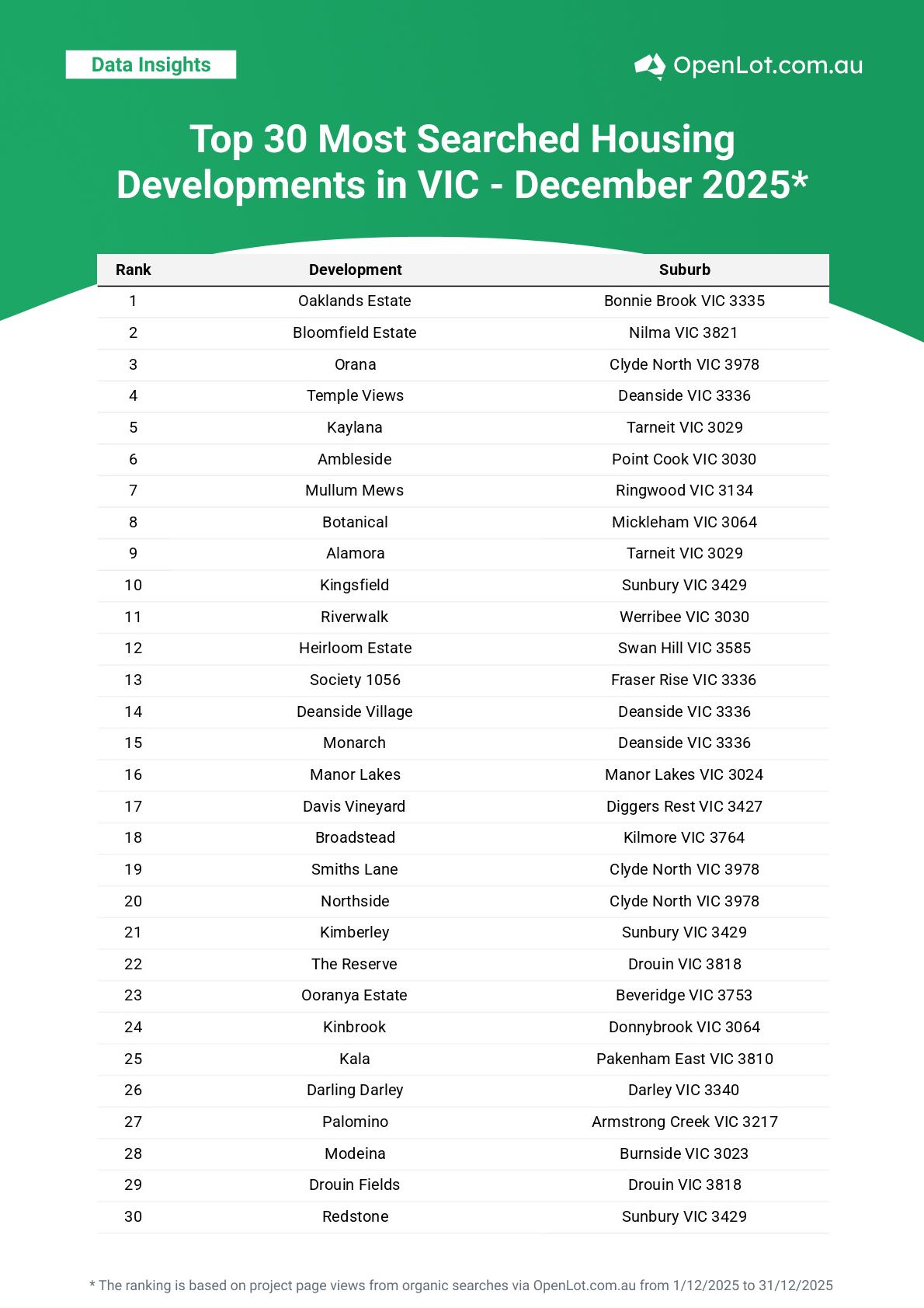 South East Queensland continued its strong run, with Toowoomba, Brisbane’s outer corridors and regional lifestyle estates all featuring heavily in December searches.