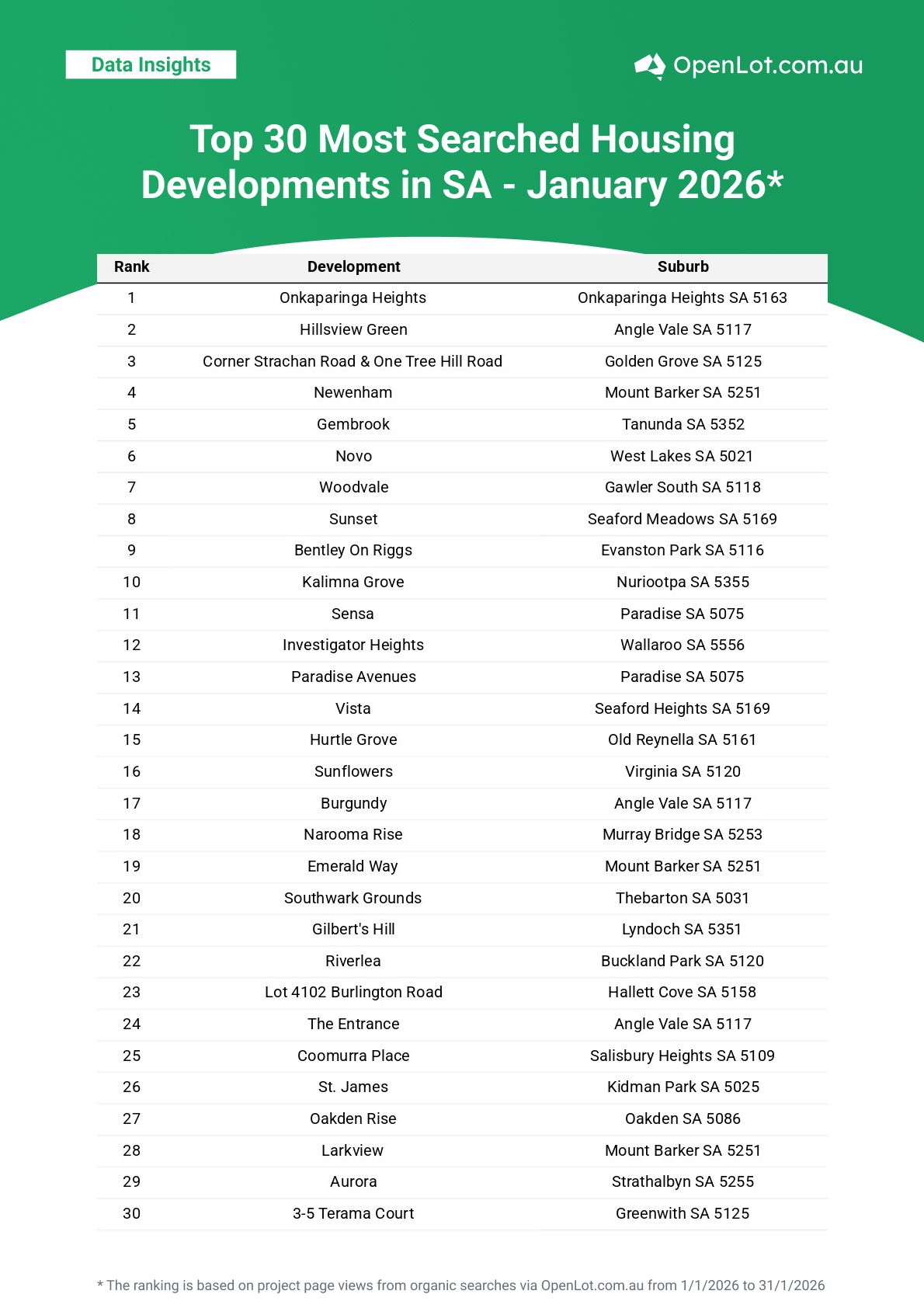 SA January results reflect steady buyer interest in Adelaide’s expanding northern and southern suburbs, alongside lifestyle-driven demand across Mount Barker and wine country regions.