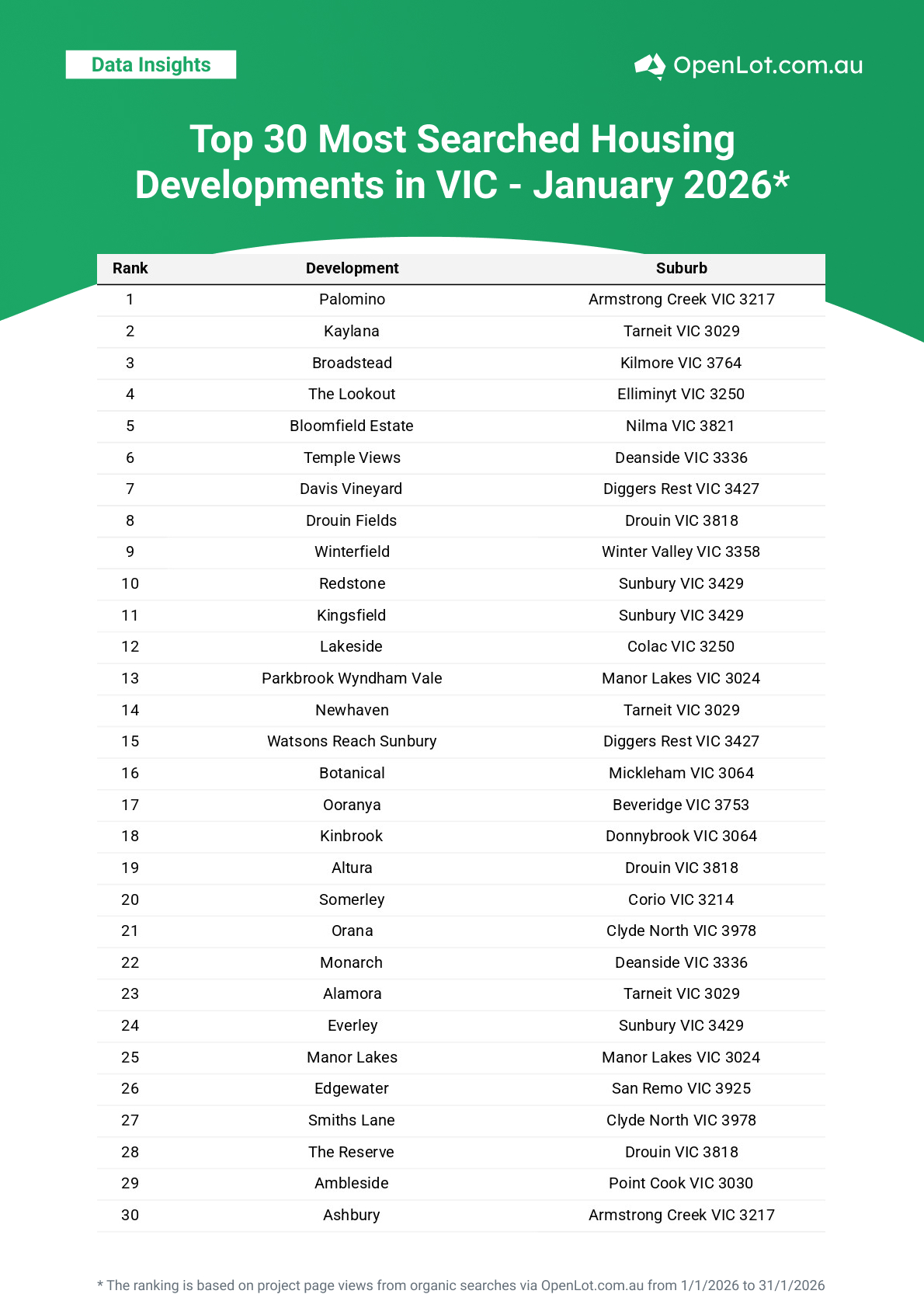 Victoria’s rankings reveal strong demand across Geelong’s growth corridor and Melbourne’s west, with buyers also showing growing interest in regional estates offering affordability and lifestyle appeal.
