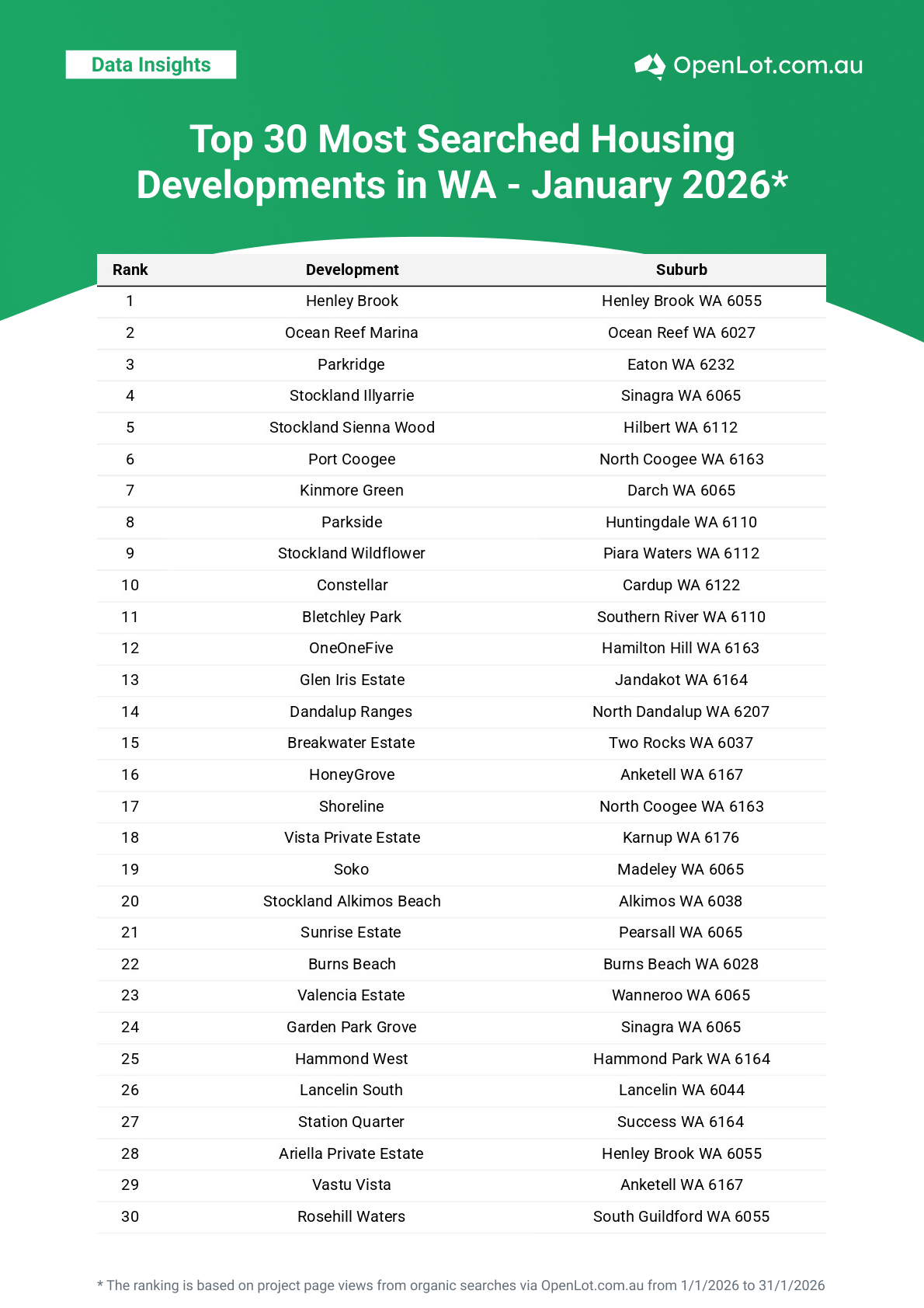 WA continues to see strong search activity across Perth’s expanding outer suburbs, with buyers gravitating towards estates offering new housing options, future infrastructure and long-term growth appeal.