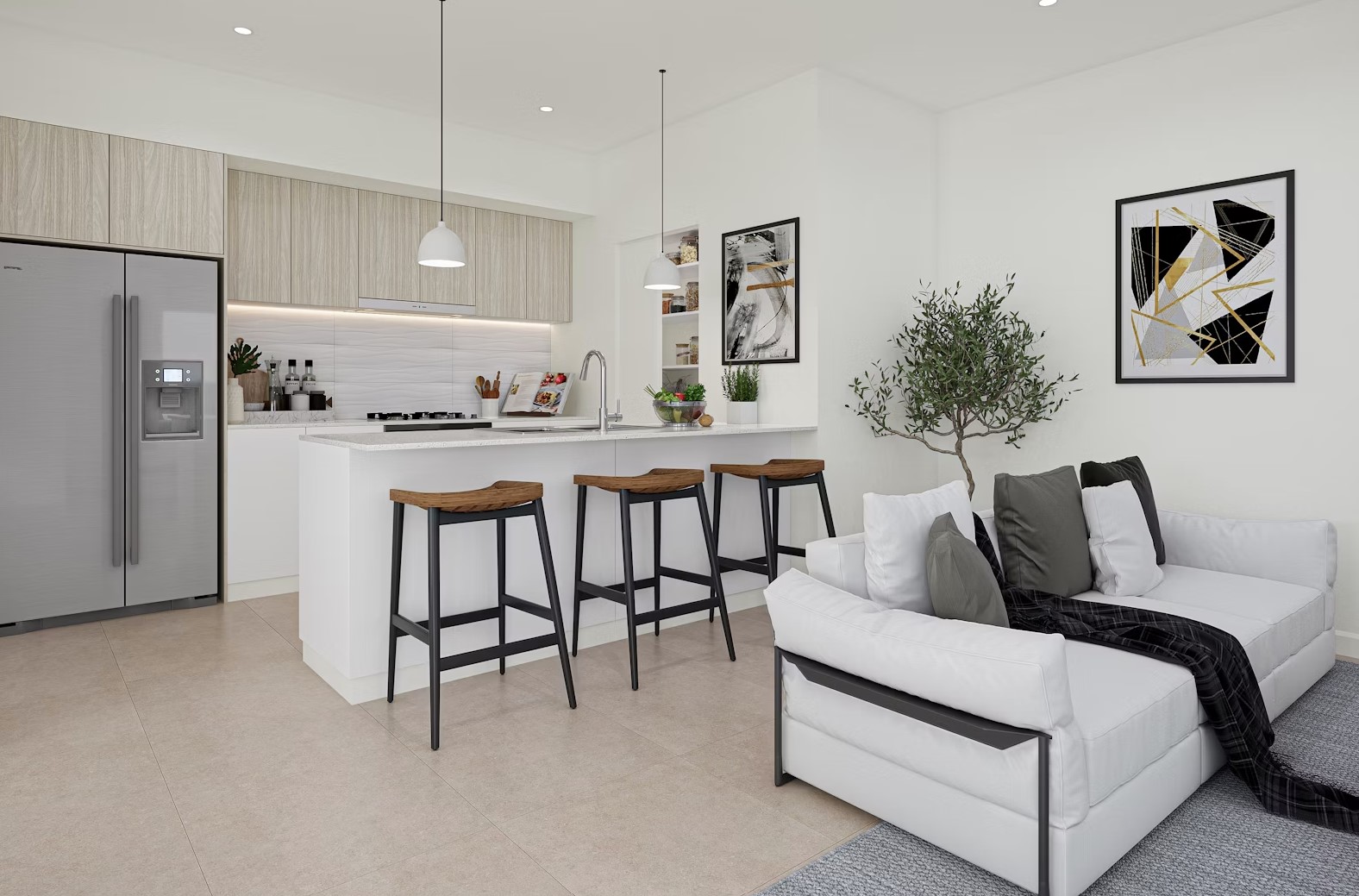 • Elegant pendant lights over the kitchen island bench