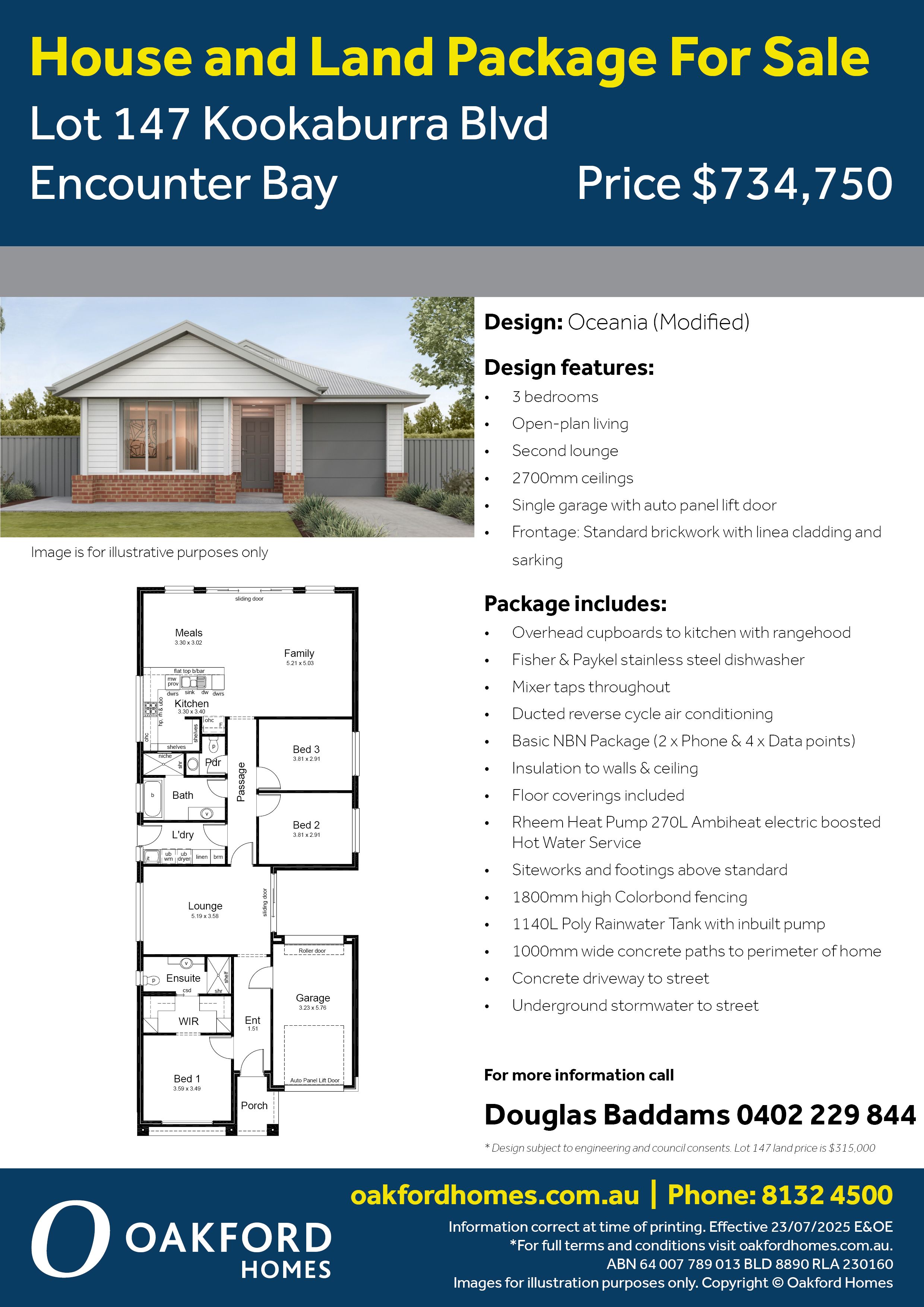 Located in Oakford Estate, Encounter Bay, this package is custom-designed to suit the land. The home offers three bedrooms, an open-plan living zone, a separate lounge, and a single garage.