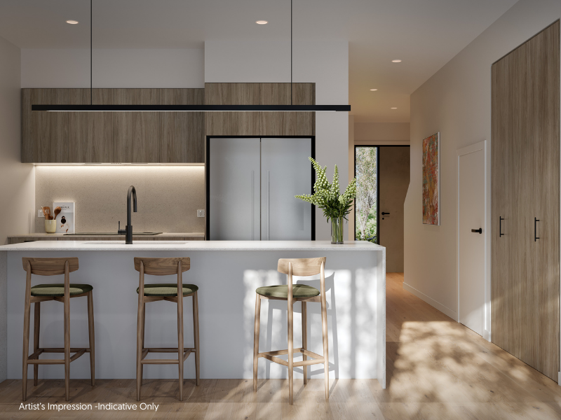 Artistās impression for illustrative purposes only. Images were produced prior to final approvals and commencement of construction and are subject to change. Finishes, fixtures, fittings, landscaping and design details are indicative only. Furniture, window furnishings, dĆ©cor, lighting and loose items shown are not included. Final specifications will be detailed in the contract for sale. Images may depict optional upgrades and nonāstandard items which are not included in the base specification.