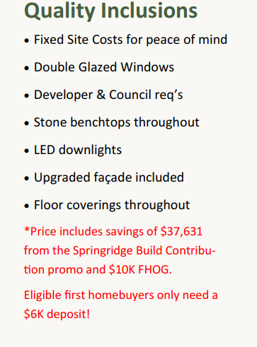 Price includes savings of $38, 386 from the Build Contribution Promo + $10K FHOG. Price includes the peace of mind of fixed site costs, developer and council requirements, upgraded ceiling height, flooring throughout, stone benchtops and downlights throughout, plus much more!