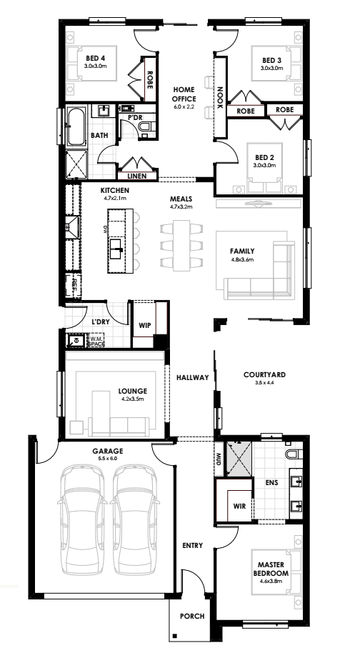 The Aylesbury 24 provides 2 separate lounge spaces, 4 bedrooms plus a study and a large gourmet kitchen featuring ample counter and storage space as well as a walk-in-pantry. This design also features a centrally located large courtyard - a fantastic way to enjoy the outdoors, with plenty of room for entertaining.
